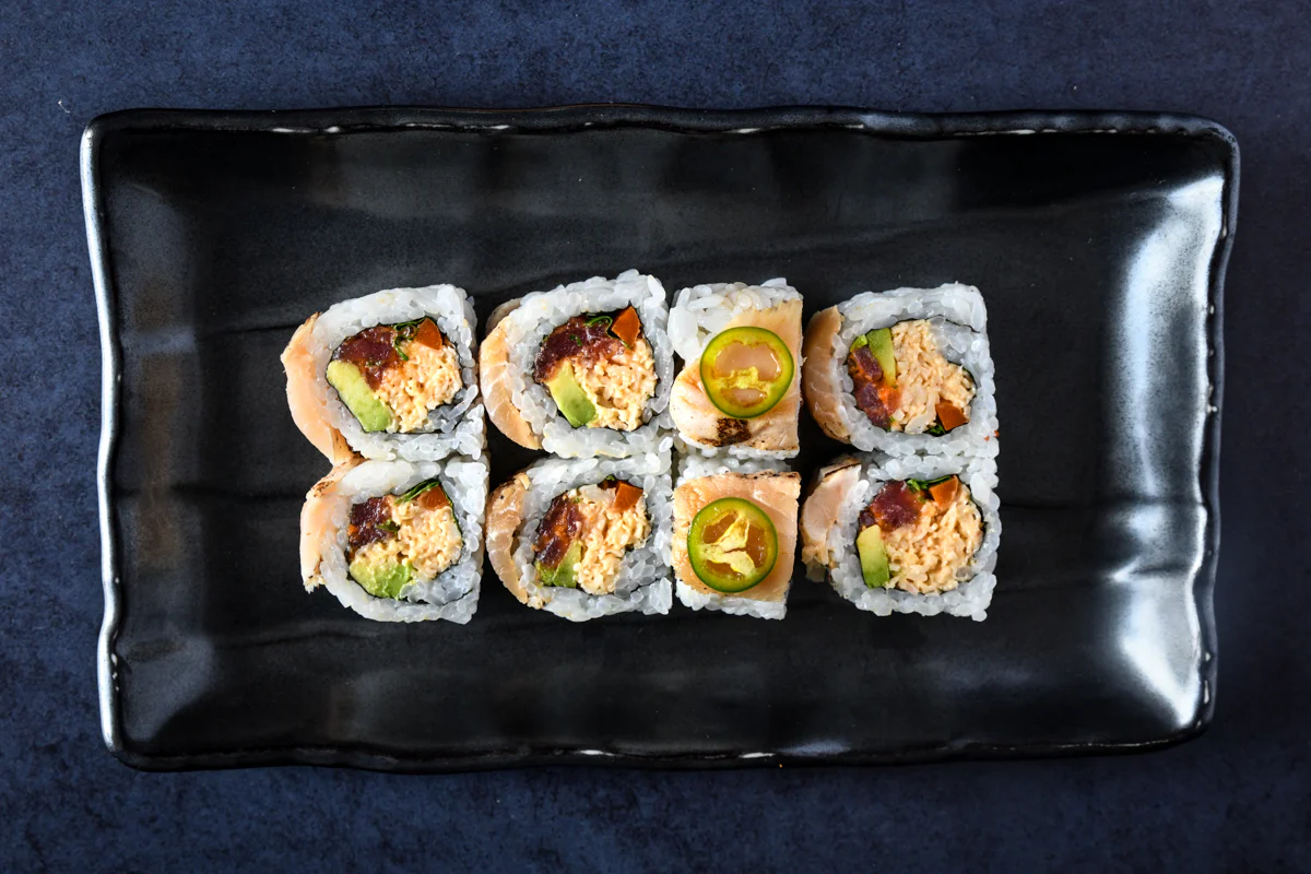crab mix, cucumber, avocado, spicy salmon, eel sauce, chili aioli (8 pcs)