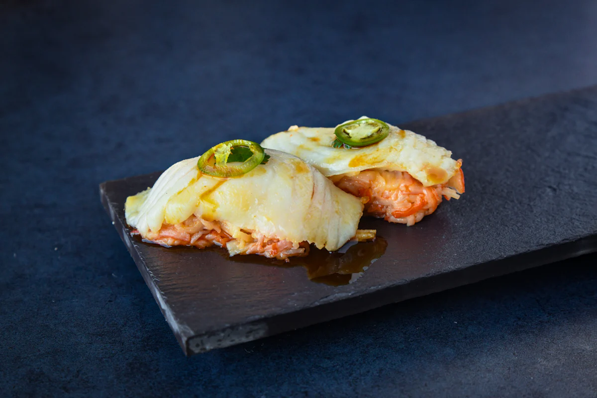 baked atlantic salmon on top of spicy crab mix, topped with serrano, cilantro and ponzu sauce (2 pcs) the seafood in this product carries an eco-certification