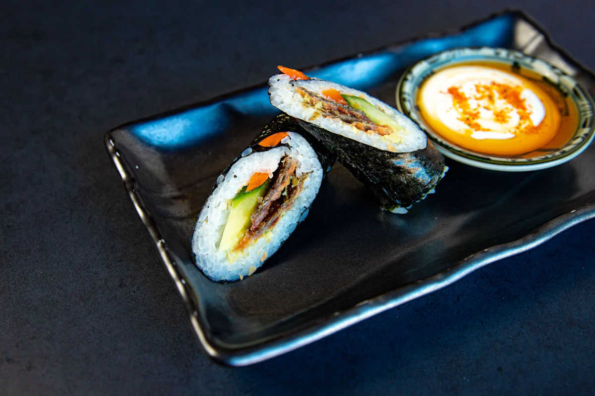 sweet potato vegan tempura, grilled asparagus, edamame hummus, sundried tomato, brown rice, soy paper, olive oil, maldon salt (8 pcs)
