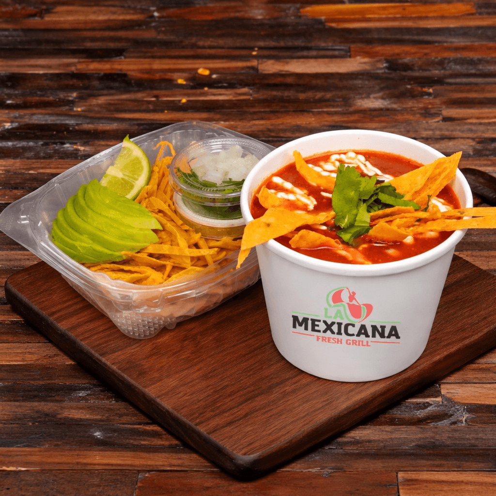 Topped with sour cream, cheese, avocado slices, chopped onion, cilantro and tortilla strips.