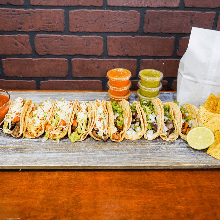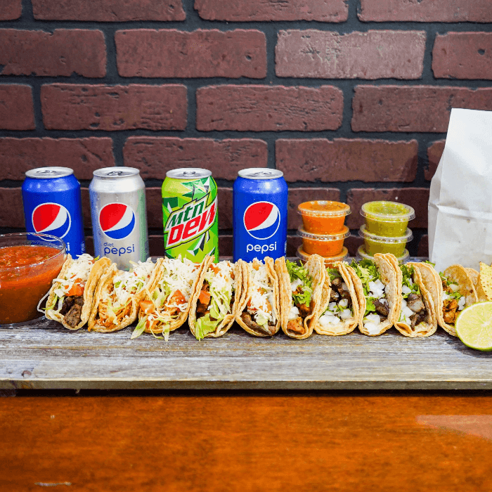 Choice of ten tacos: Mexican style (cilantro and onions) or American Style (lettuce, tomatoes and cheese) tacos served with a large chips and salsa and 4 canned drinks.