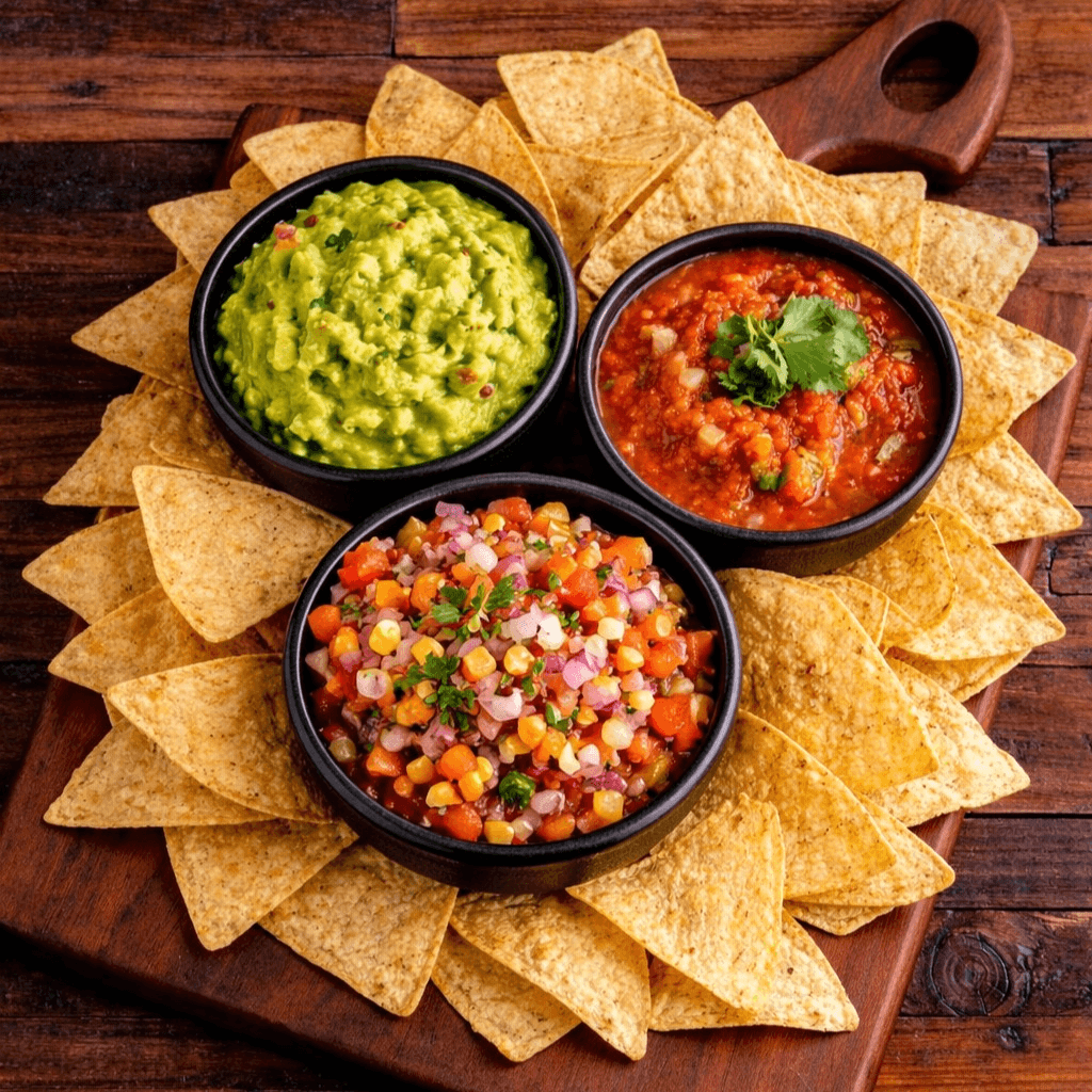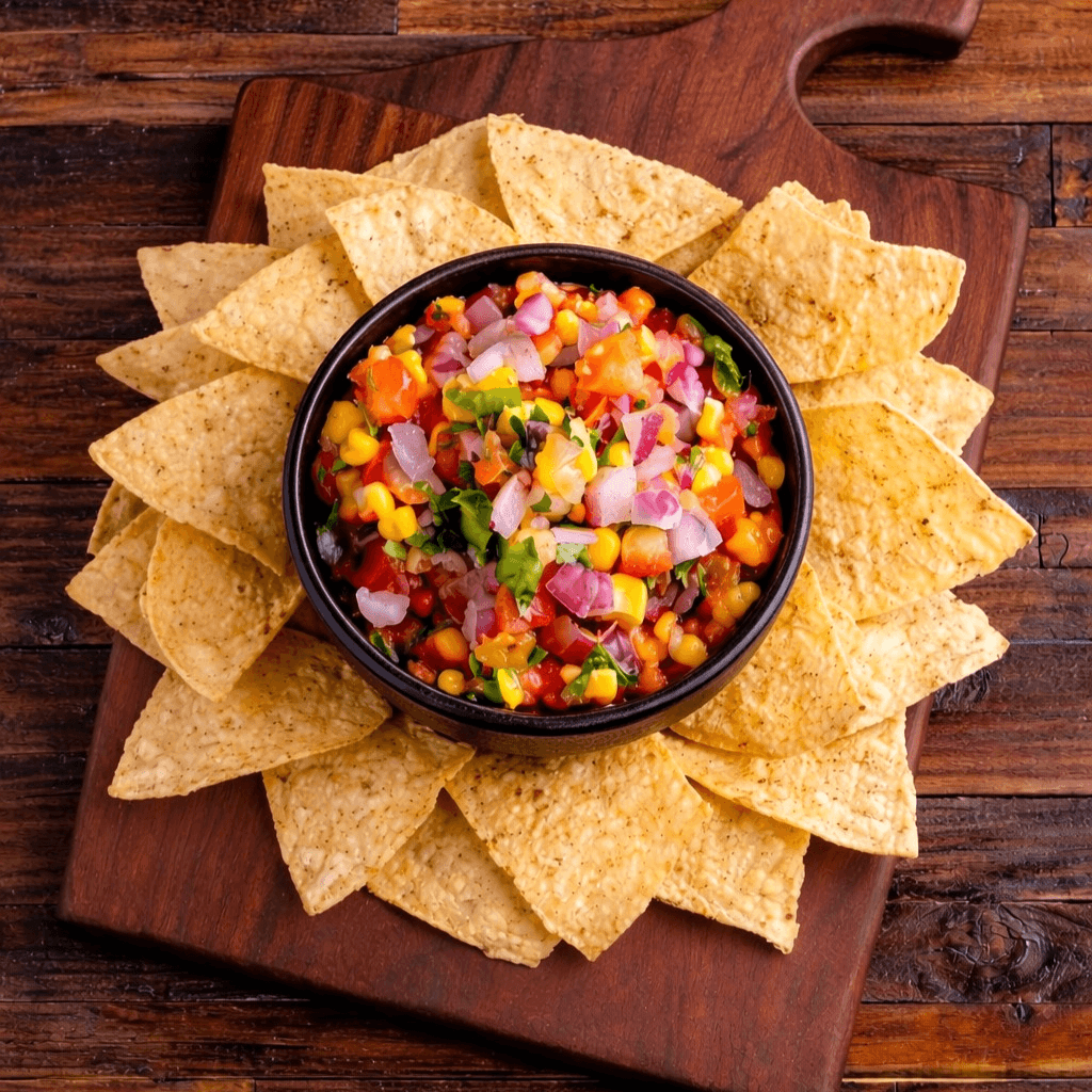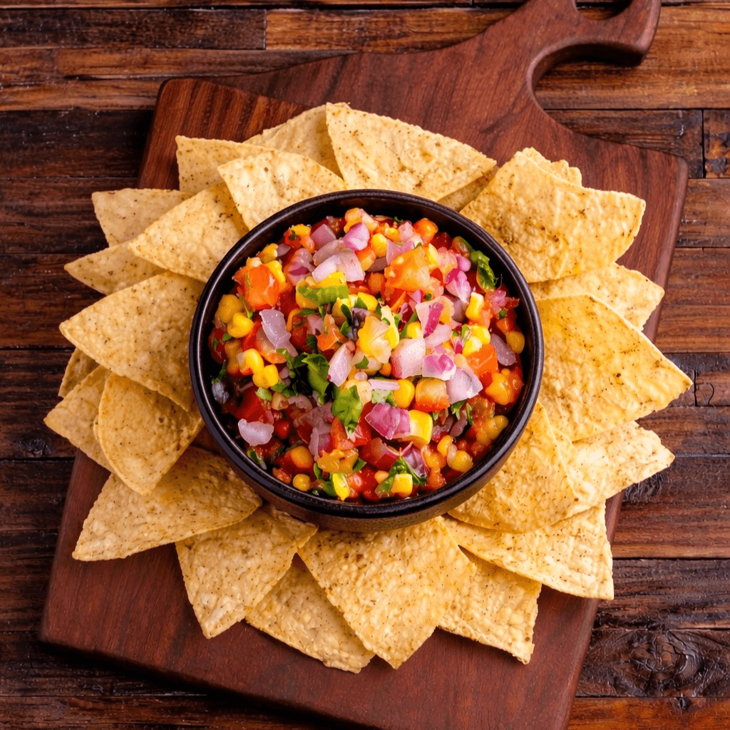 Fresh diced tomatoes, chopped onions, cilantro, serrano peppers, sweet corn and squeezed lime with a side of tortilla chips.