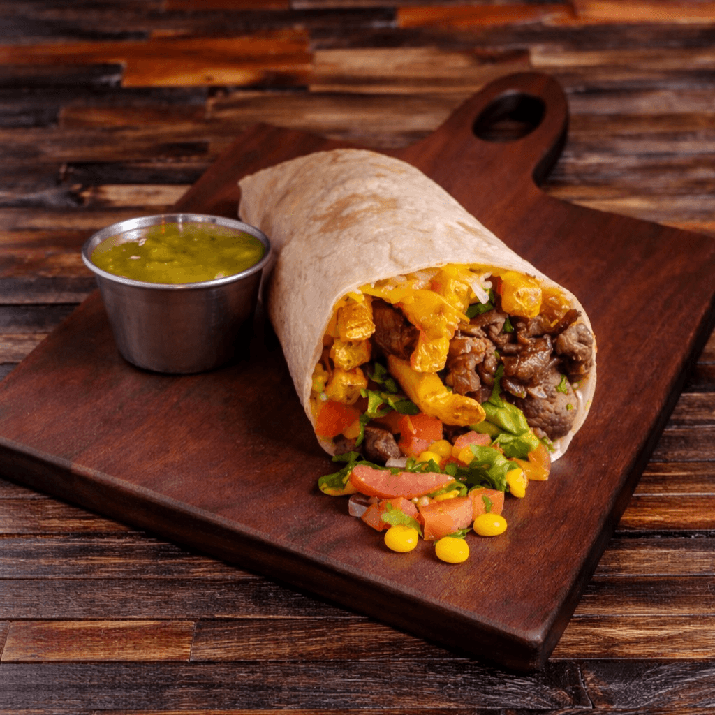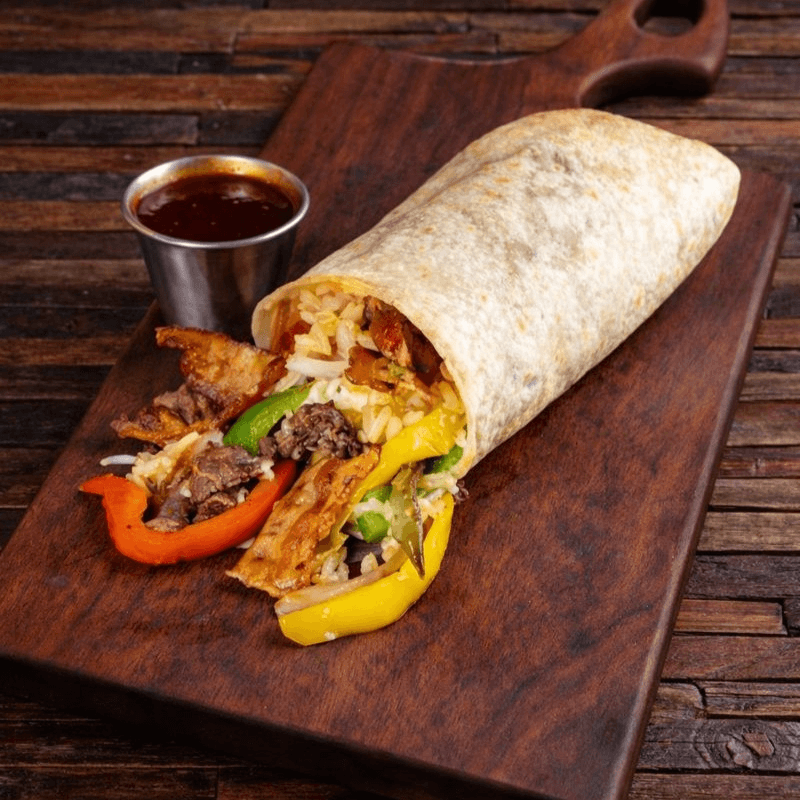 12" flour tortilla filled with choice of protein, fajita veggies and cheese. Served with a side of sour cream and guacamole.