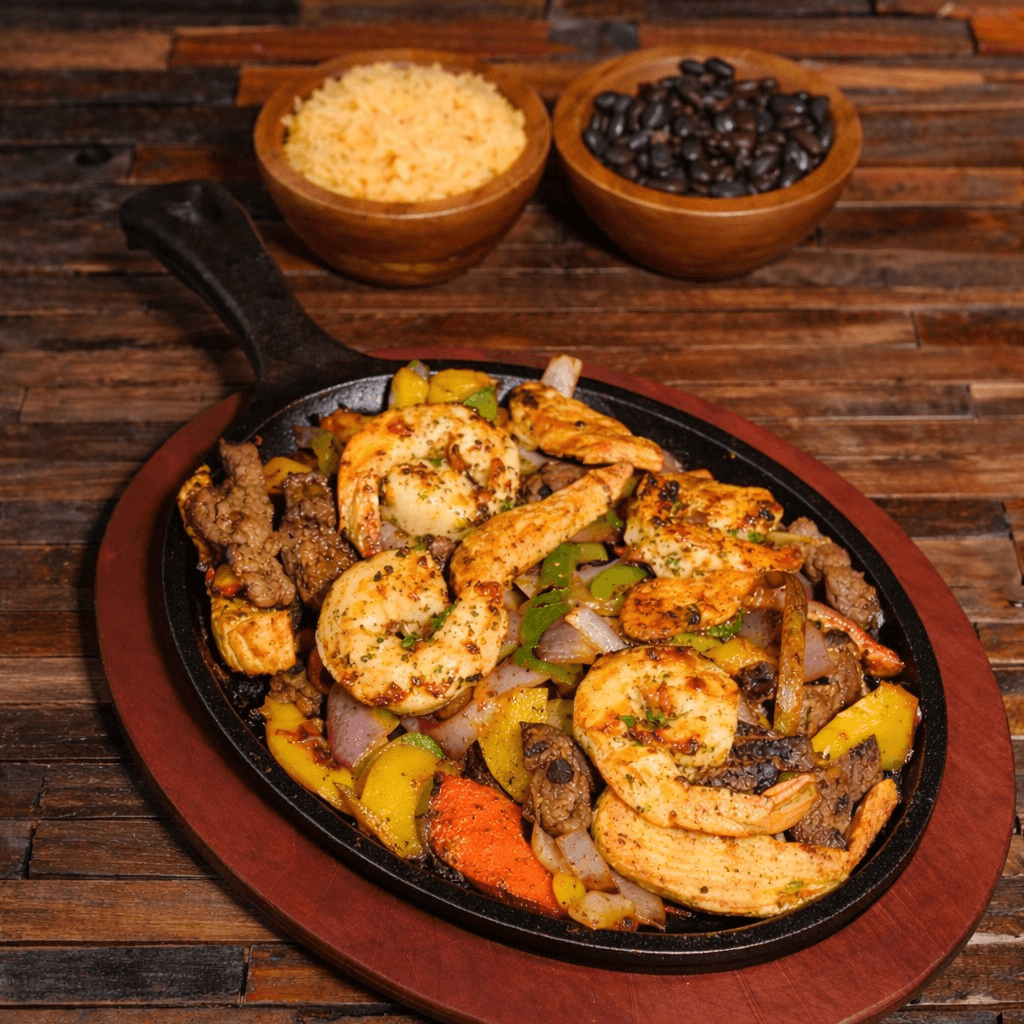 Shrimp, fajita veggies, corn or flour tortillas sour cream, cheese, pico De gallo, lettuce and guacamole. Served with rice and black beans.