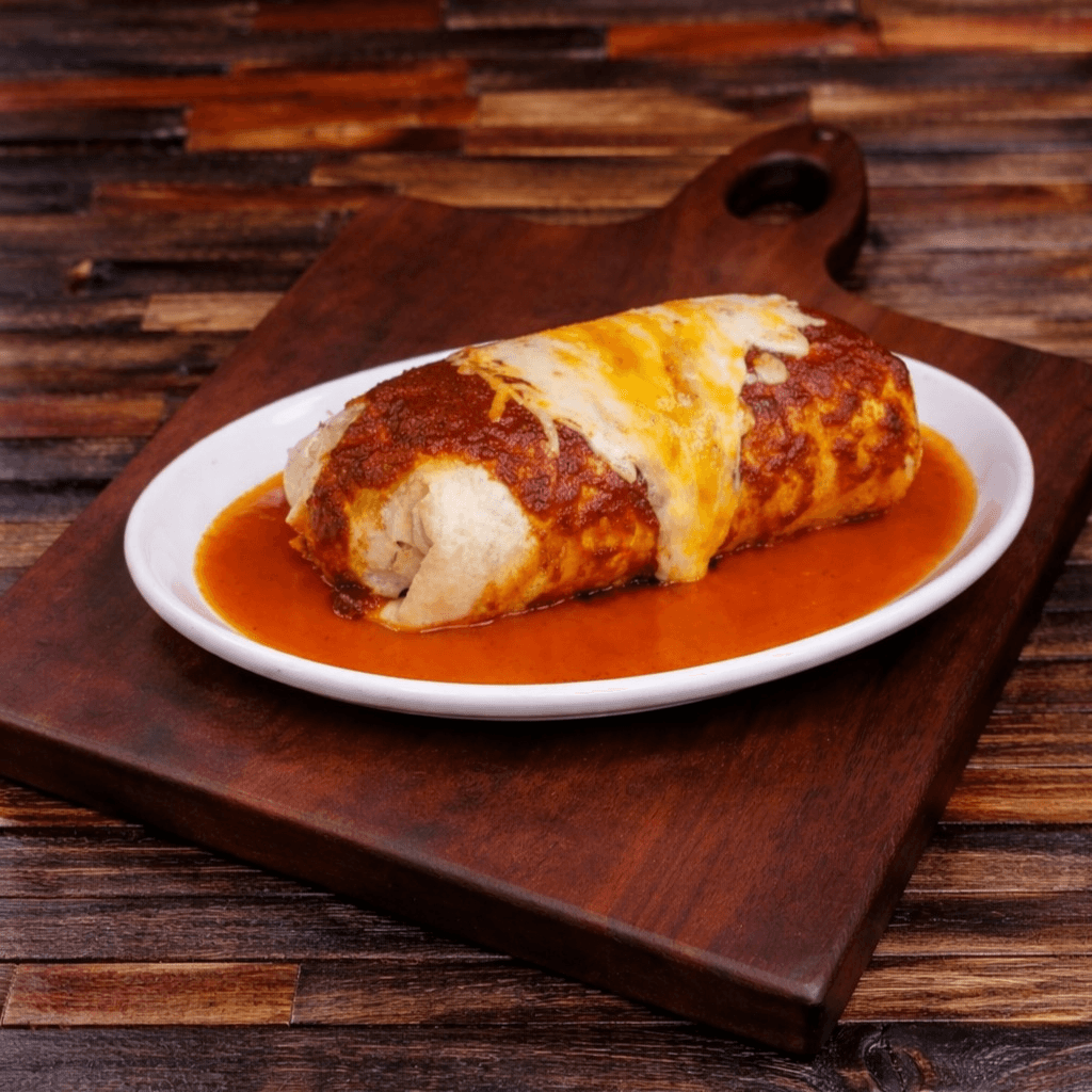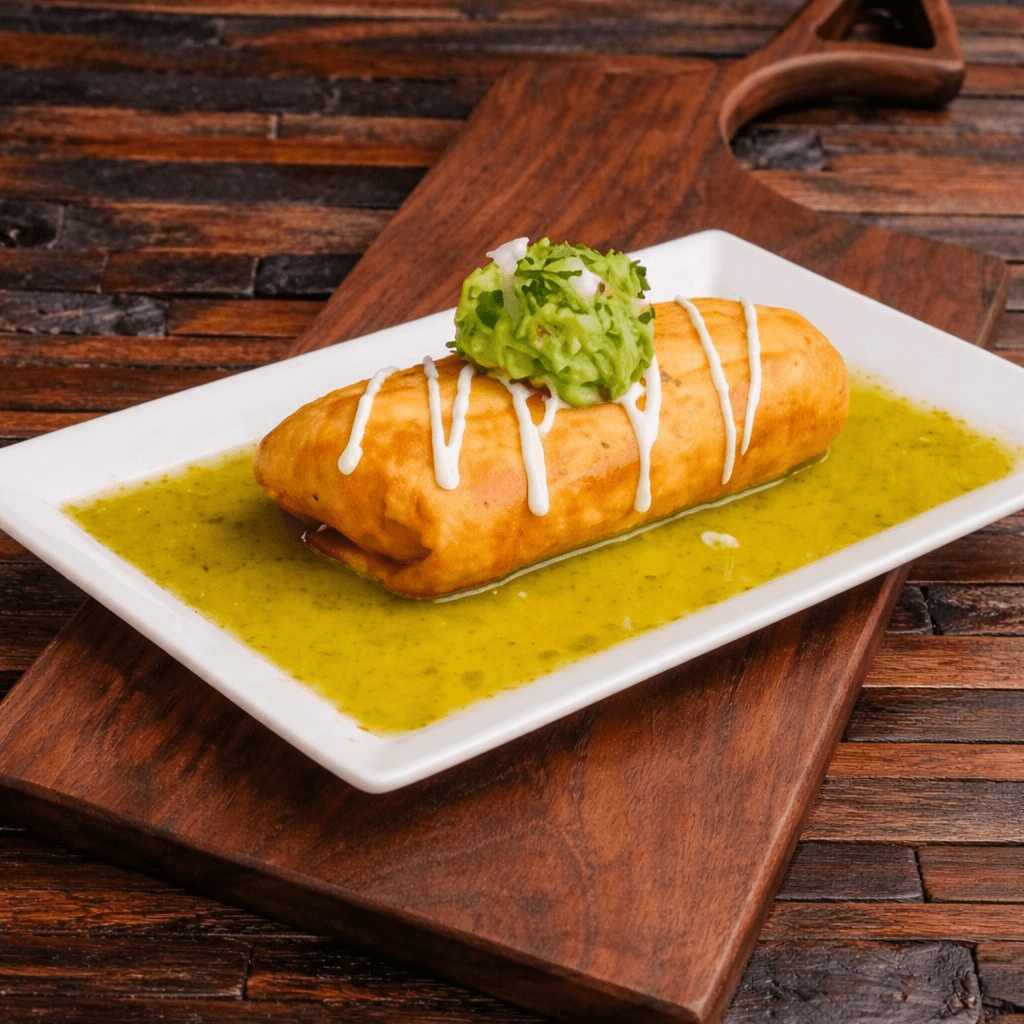 Deep fried burrito with choice of protein, pinto beans and cheese. Topped with fresh guacamole and sour cream over green tomatillo sauce.