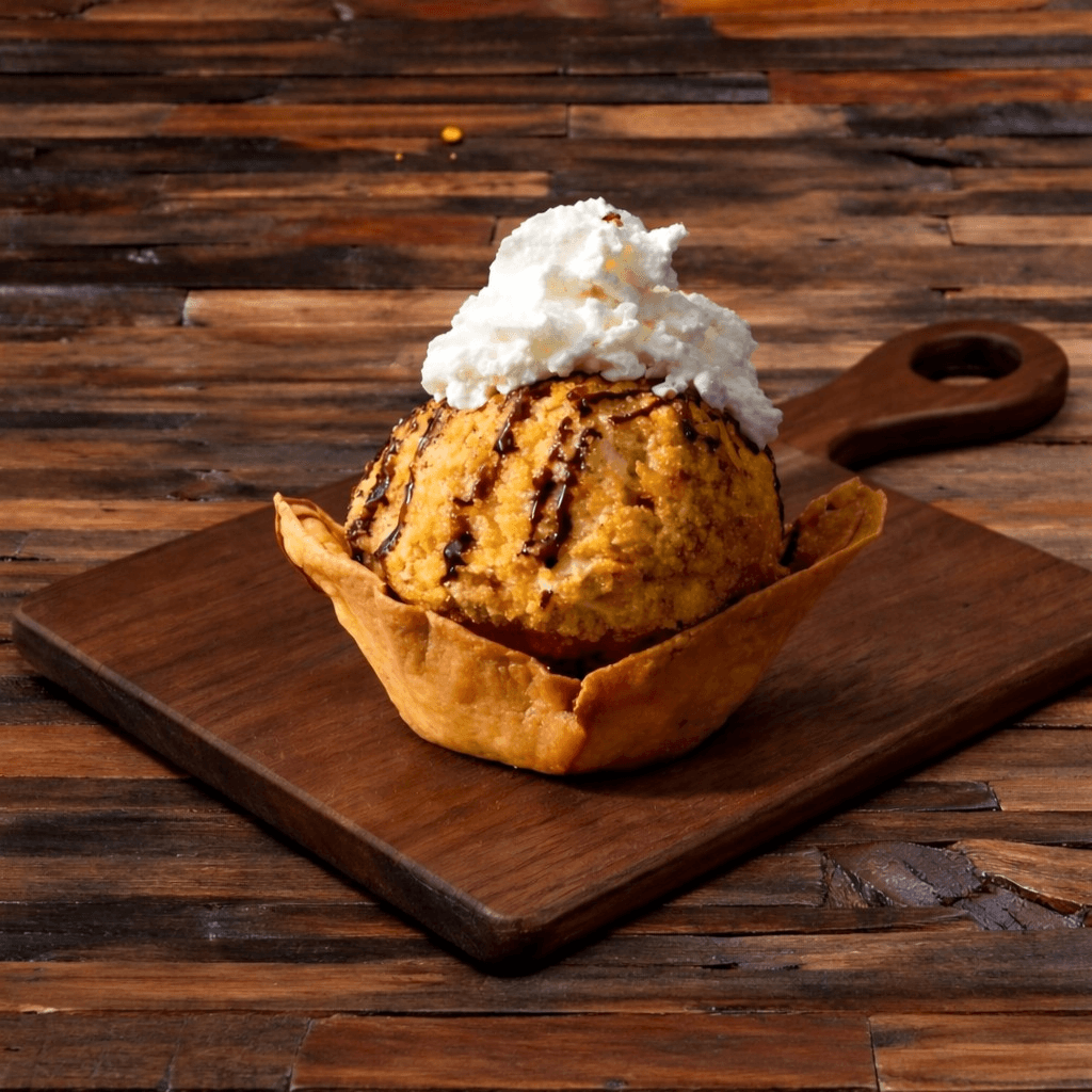 Vanilla ice cream coated with sugar corn flakes, fried and topped with chocolate sauce and covered with whipped cream.