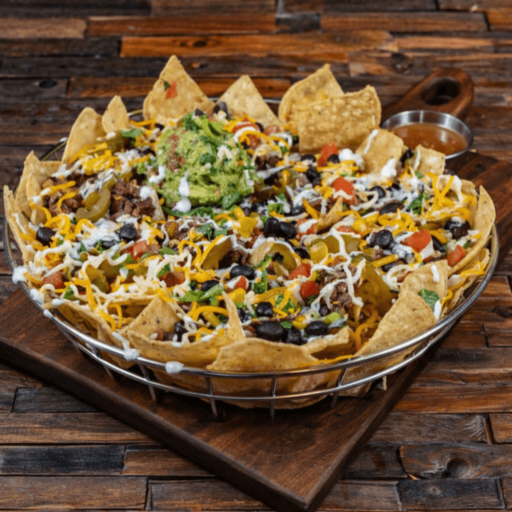 Tortilla chips topped with choice of protein, choice of cheese, black beans, sour cream, pico De gallo, jalapenos and fresh guacamole.