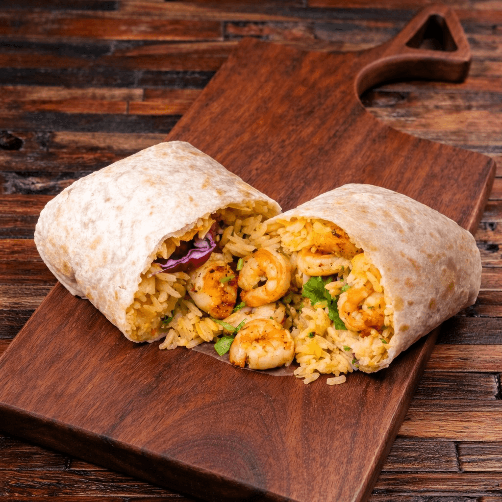 Seasoned grilled shrimp, rice, coleslaw, cilantro, sliced avocado and chipotle mayo.