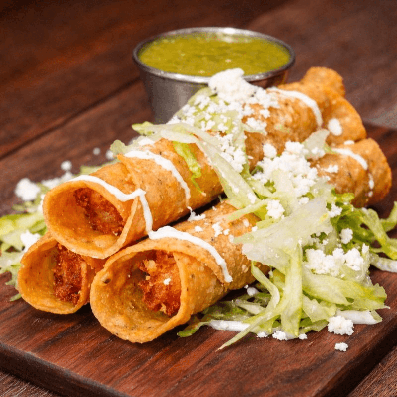 Four crispy fried tacos filled with chipotle chicken topped with cheese, sour cream, lettuce and guacamole. Served with rice and refried beans.