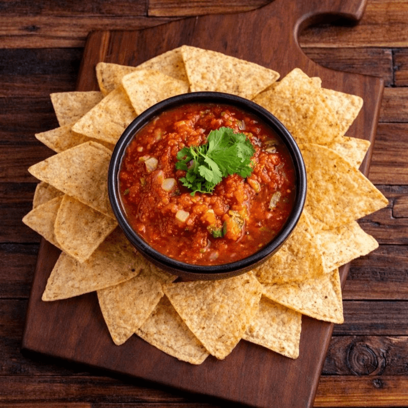 Homemade fresh salsa made with fresh tomatoes, onions, cilantro and serrano peppers with a side of tortilla chips.