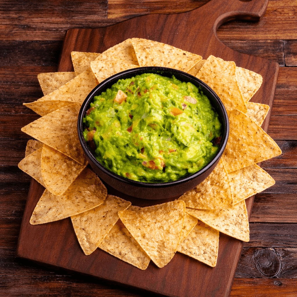 Fresh homemade guacamole. Mixed everyday with fresh Mexican avocados, diced tomatoes, chopped serrano peppers, chopped onions, cilantro and squeezed lime with a side of tortilla chips.