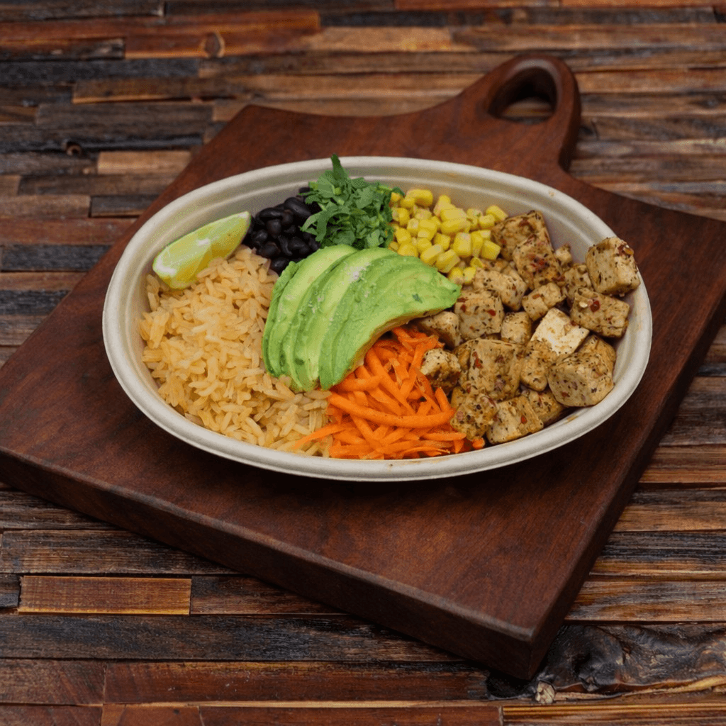 Grilled seasoned tofu, rice, sliced avocado, cilantro, shredded carrots, black beans and avocado sauce.