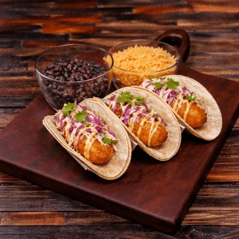 Fried avocado slices topped with coleslaw, pickled onions, chipotle mayo or avocado salsa. Served with rice and black beans.