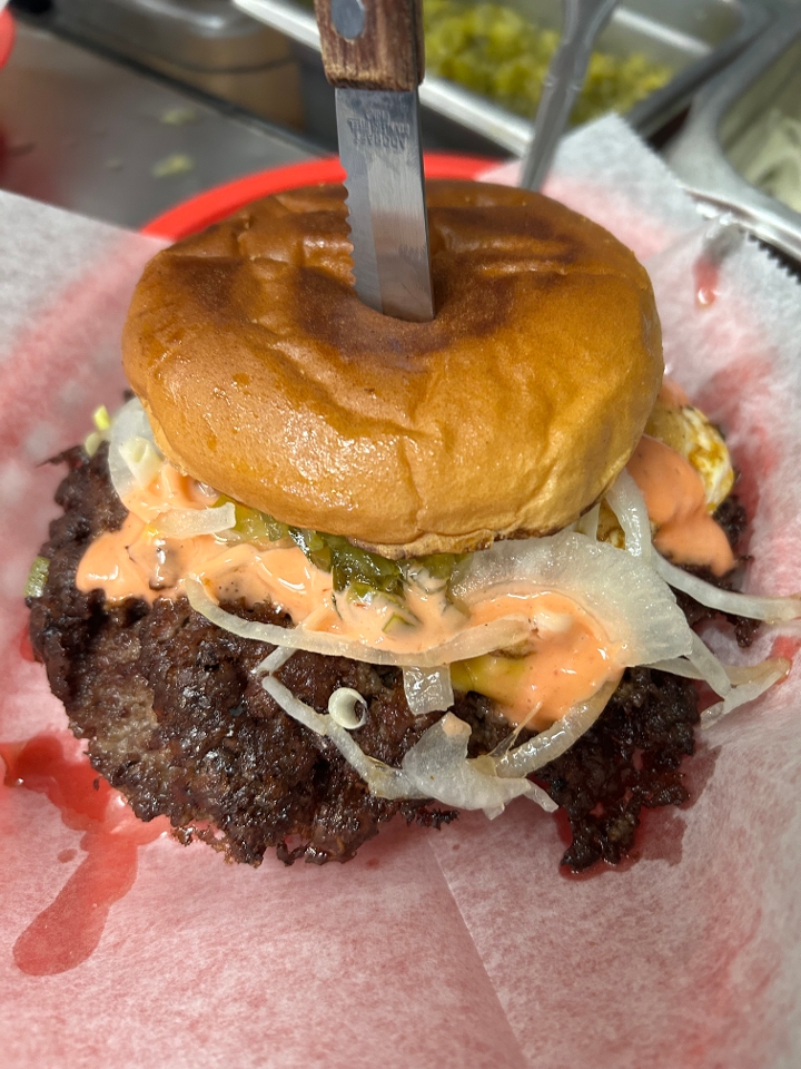 1/4 pound version of the single cheeseburger. comes with Region sauce, relish and onions