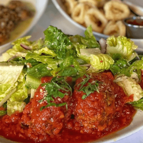 Our Fabulous Meatballs, Romaine Salad, Red Wine Vinaigrette