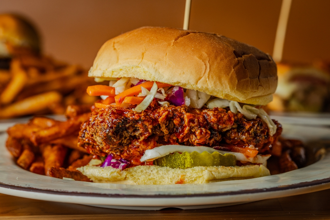 house-breaded chicken breast, lettuce, tomato, red onion, charred onion aioli on a butter toasted brioche bun | gluten free bun available (toss in any wing sauce +$1)