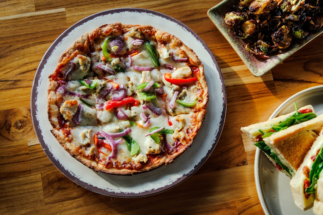 mozzarella, grilled chicken, red onion, sautéed peppers, bbq sauce**
