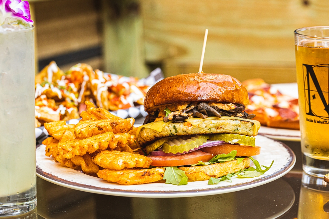 house veggie patty made with red & black beans, basmati rice, potato, jalapeno chilies & roasted corn topped with sautéed mushrooms, smoked vegan gouda, arugula, tomato, onion, pickle and house kimchi aioli