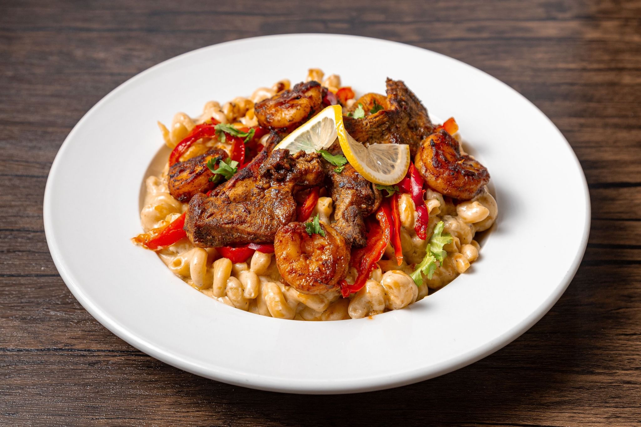 Creamy jambalaya pasta sauce with tomatoes, garlic, and chicken sausage. Topped with hand trimmed chicken breast and sauteed shrimp.