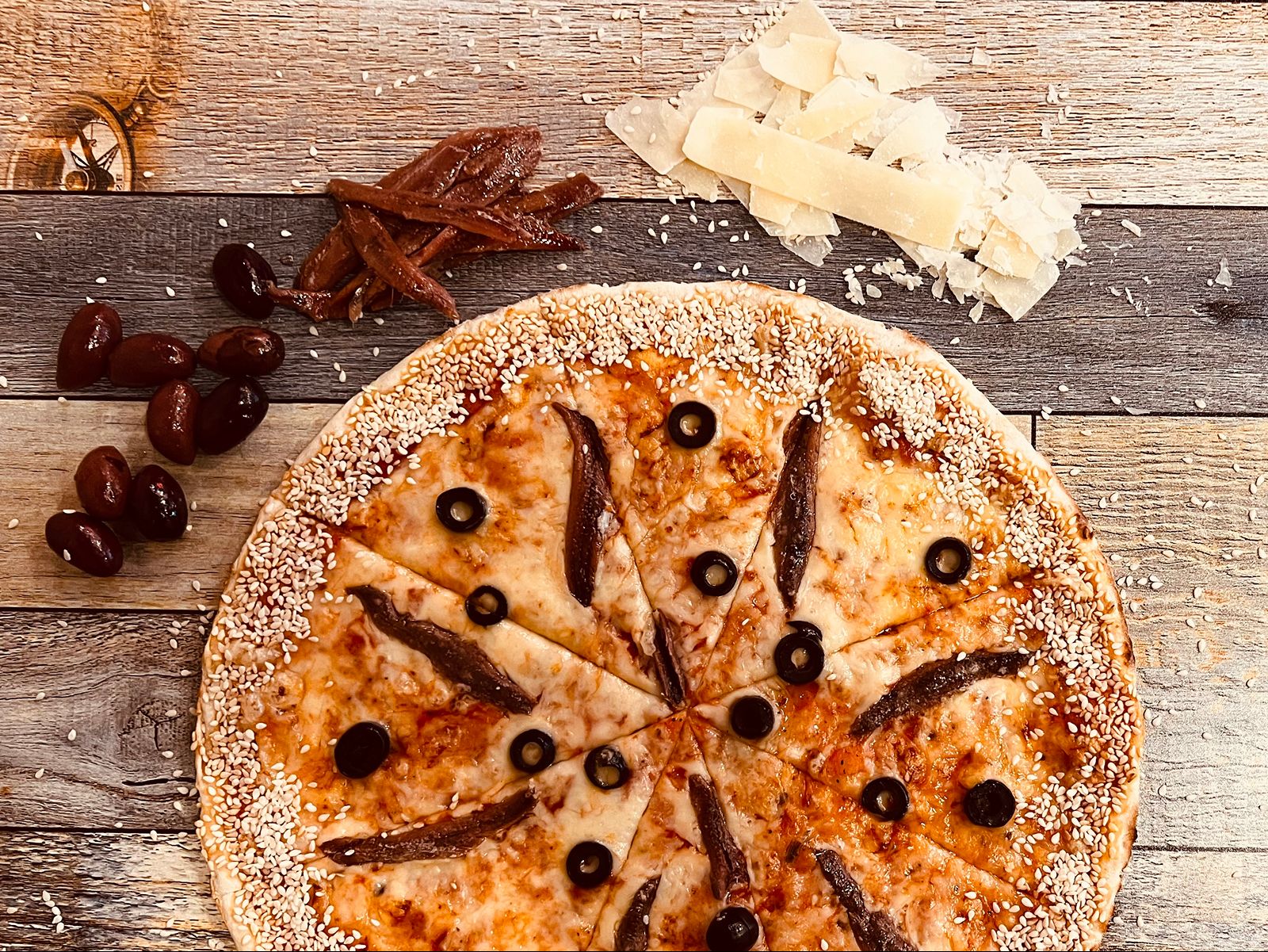 Tomato sauce, special proper cheese, anchovies, olives, sesame seeds.