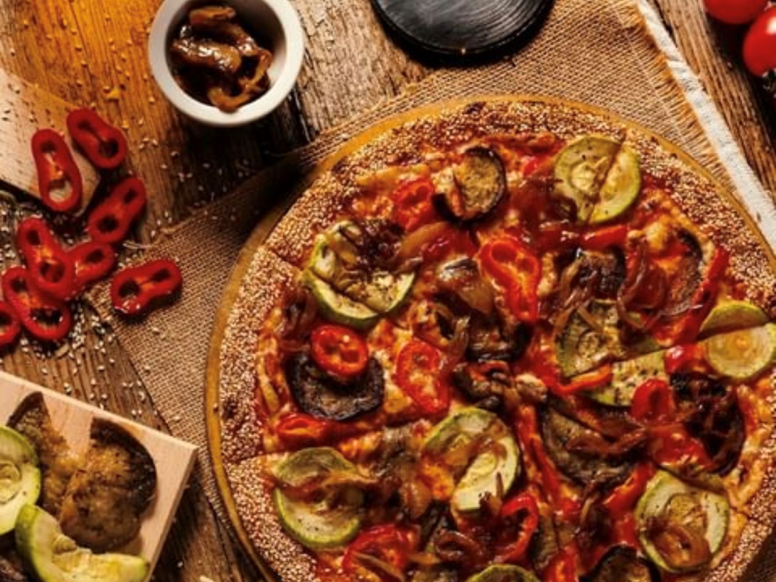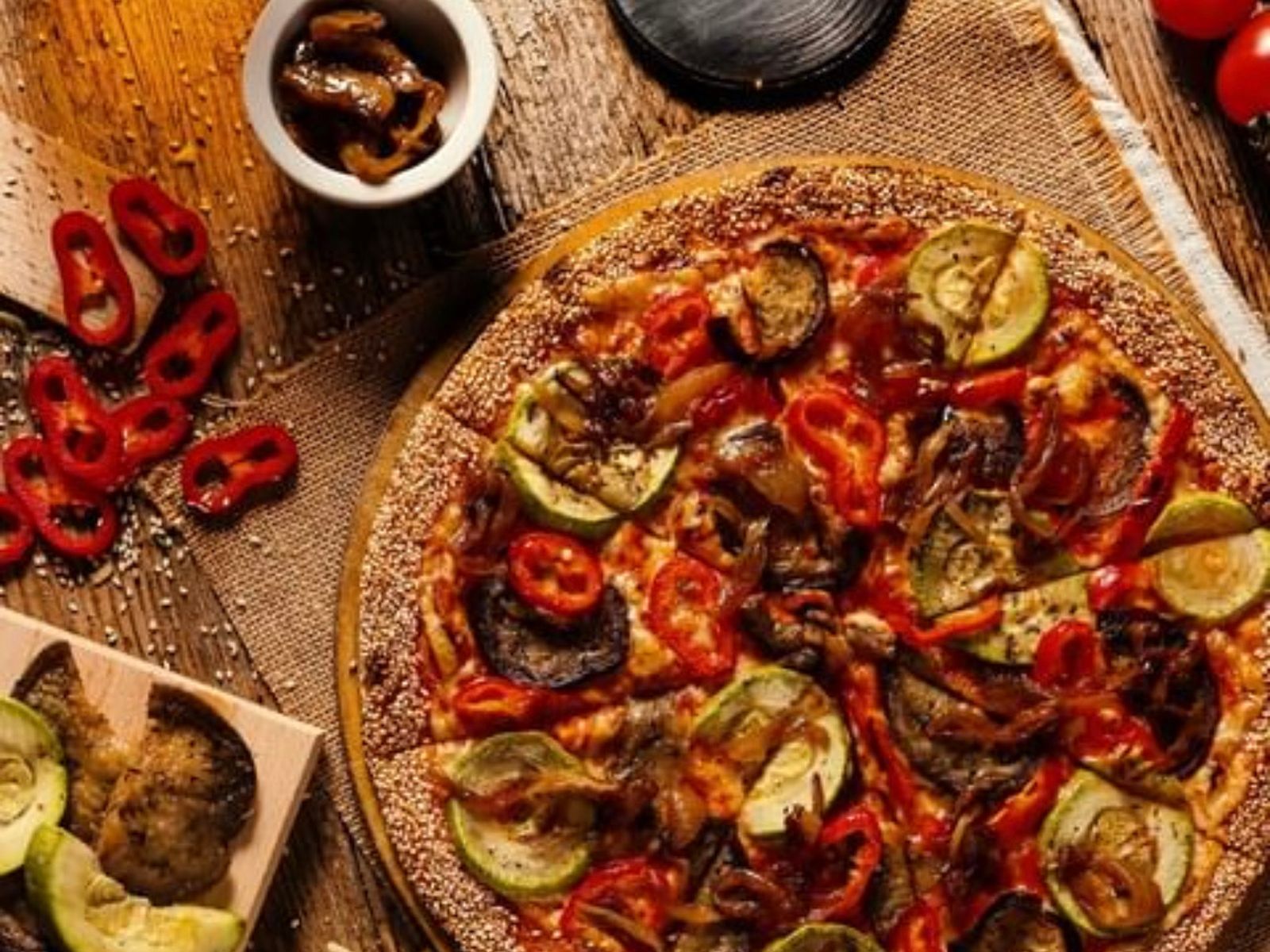 Tomato sauce, vegan vitialite mozzarella cheese, mixed peppers, zucchini, eggplants, onions, and sesame seeds.