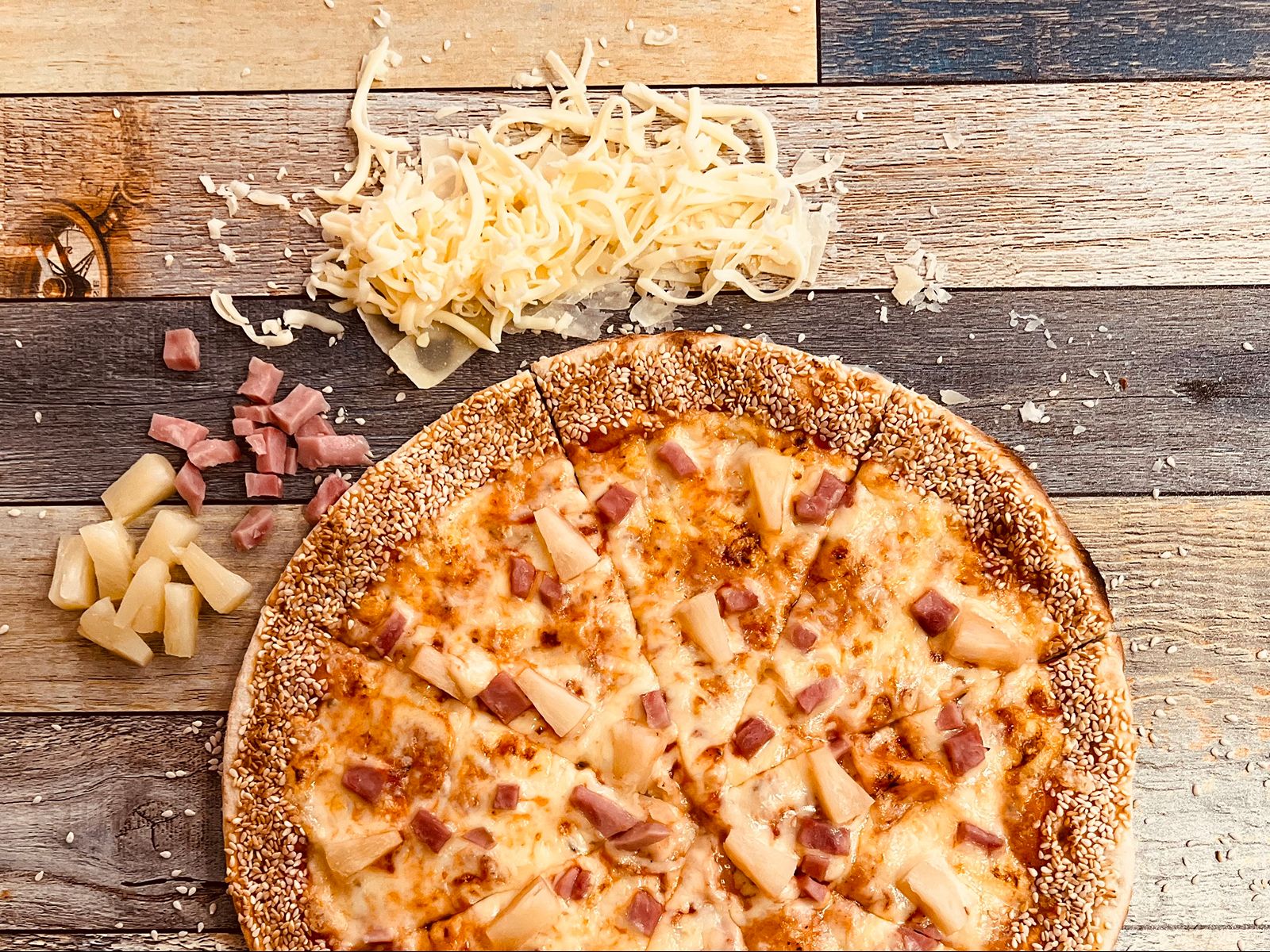 Tomato sauce, special proper cheese, pineapple, ham, and sesame seeds.