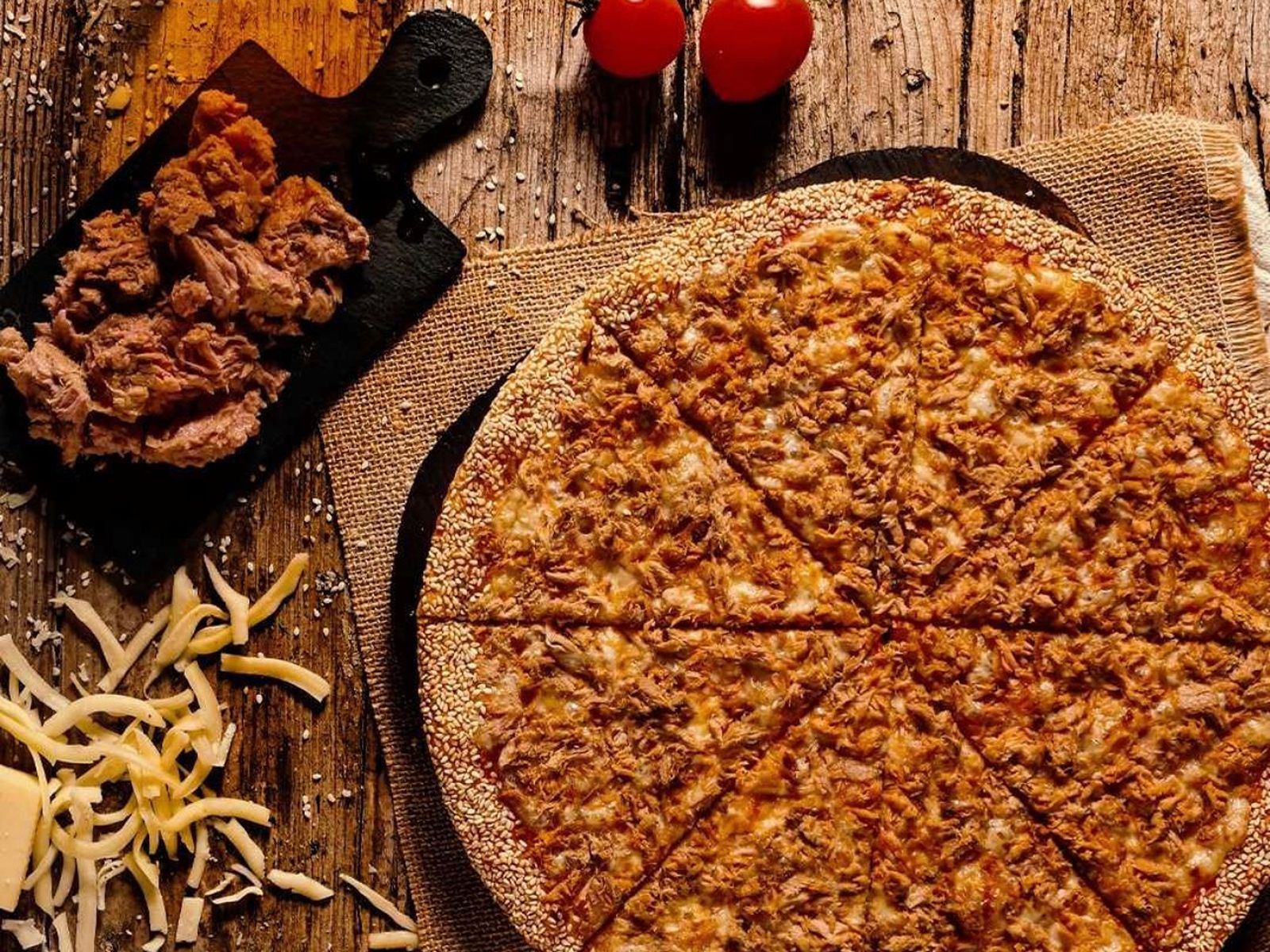 Tomato sauce, special proper cheese, tuna fish, sesame seeds.