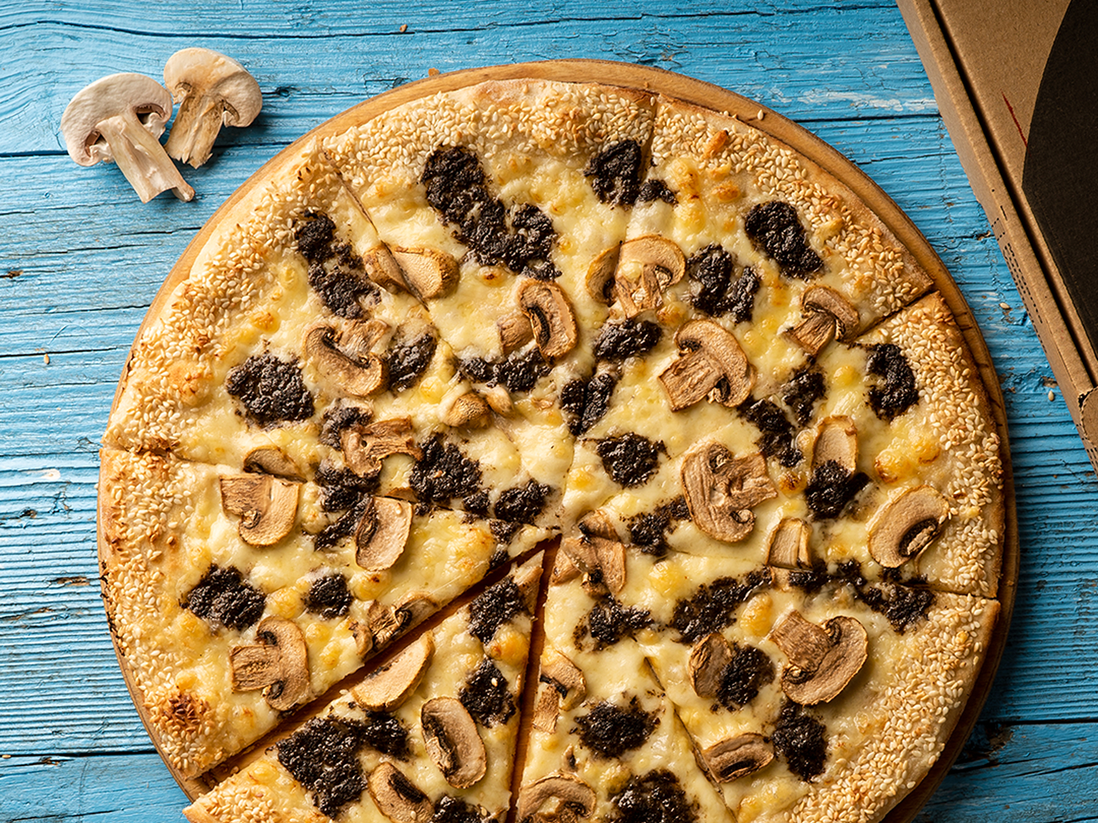 White sauce, truffle paste, truffle oil, mushrooms, pecorino cheese, pine nuts, sesame seeds.