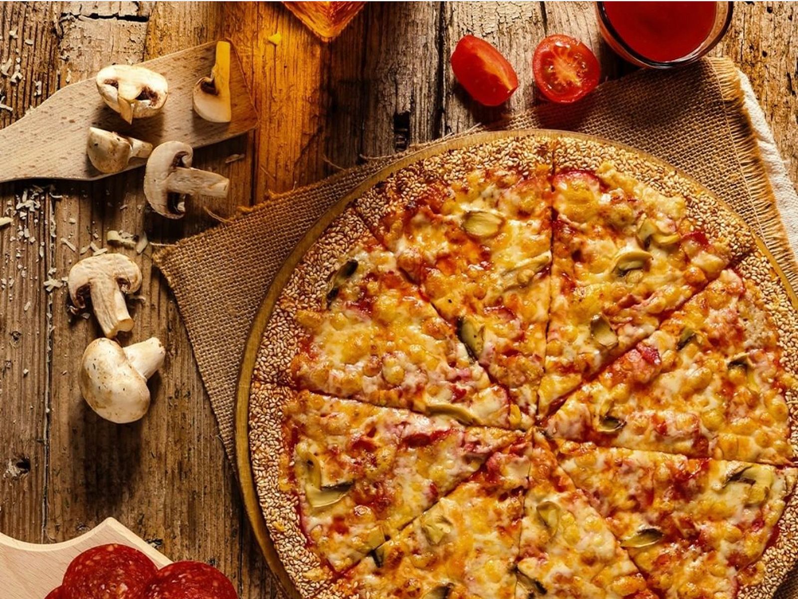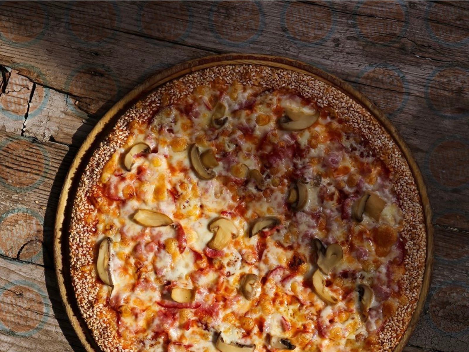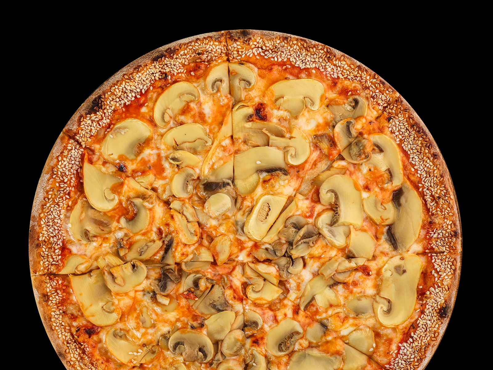 Tomato sauce, special proper cheese, mushrooms, sesame seeds.