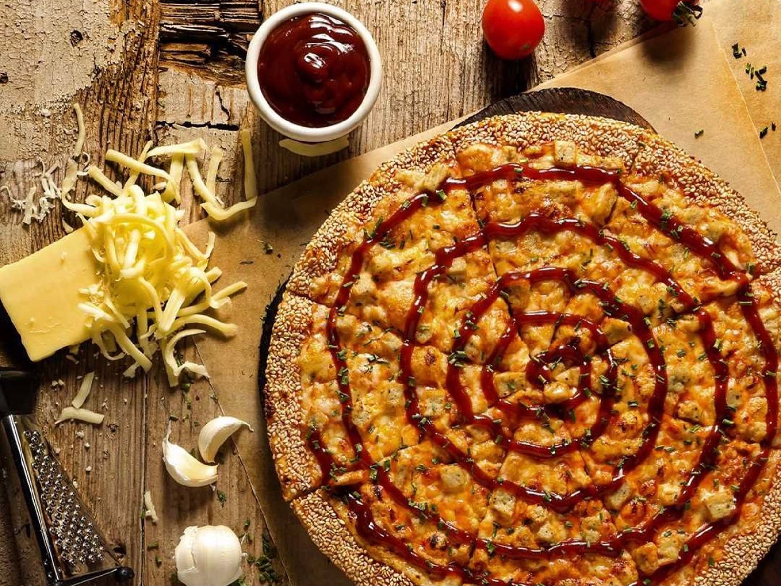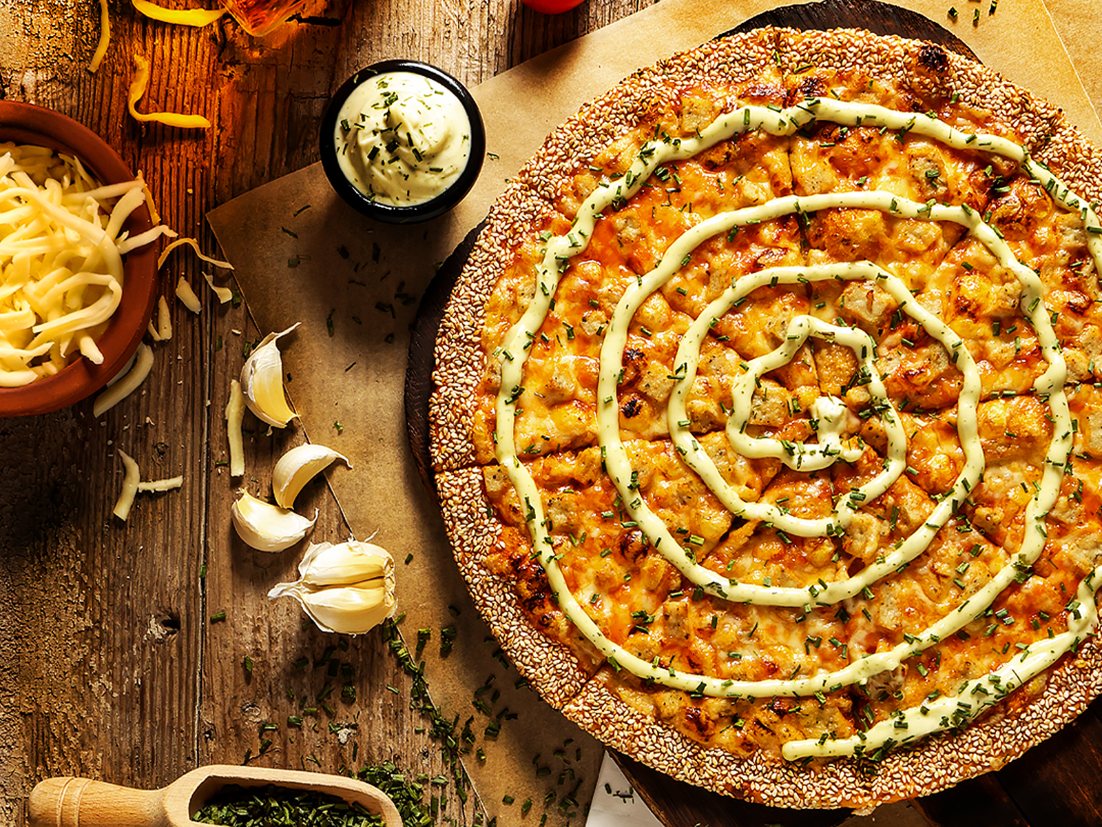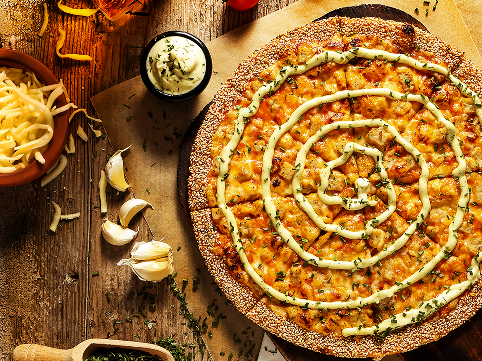 Tomato sauce, special proper cheese, chicken, bbq sauce, and sesame seeds.