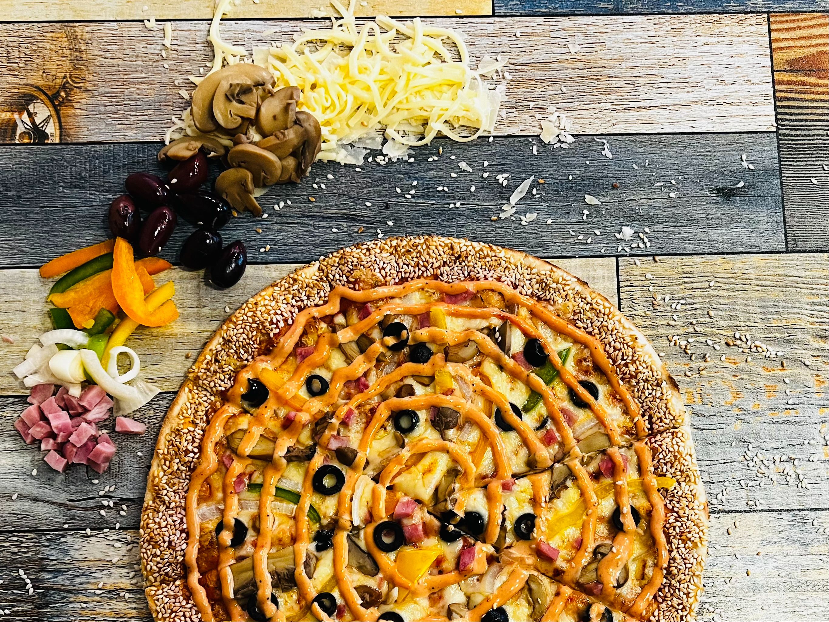 Tomato sauce, special proper cheese, ham, sliced black olives, onions, mixed peppers, mushrooms, loca sauce, sesame seeds.