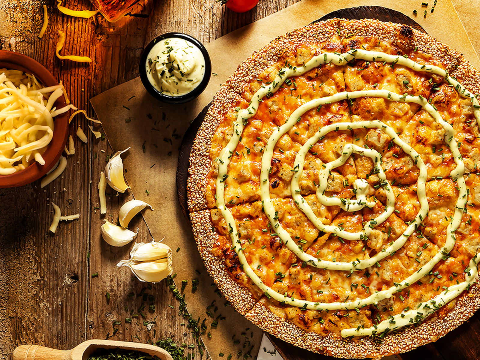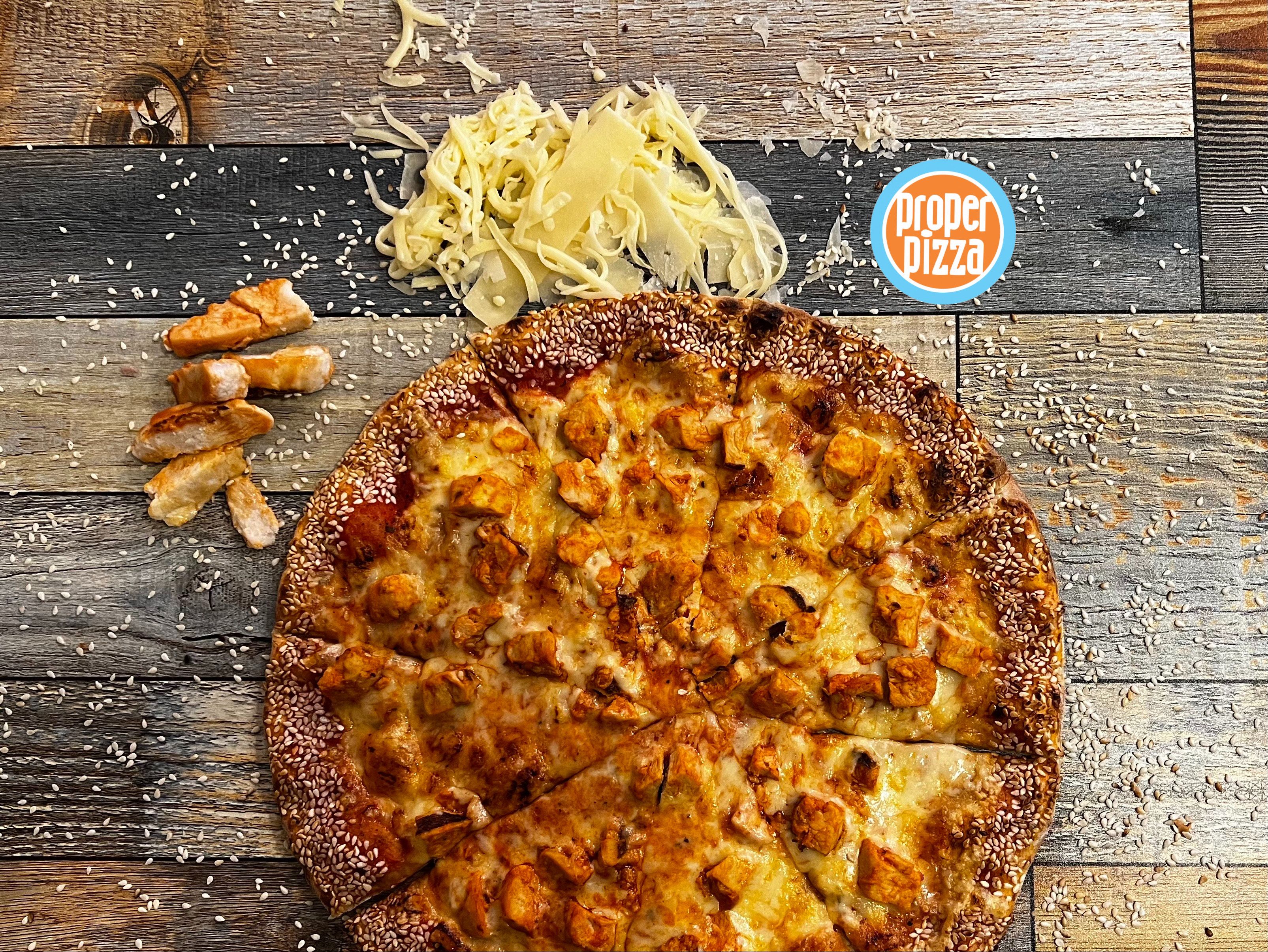 Tomato sauce, special proper cheese, buffalo chicken, and sesame seeds.