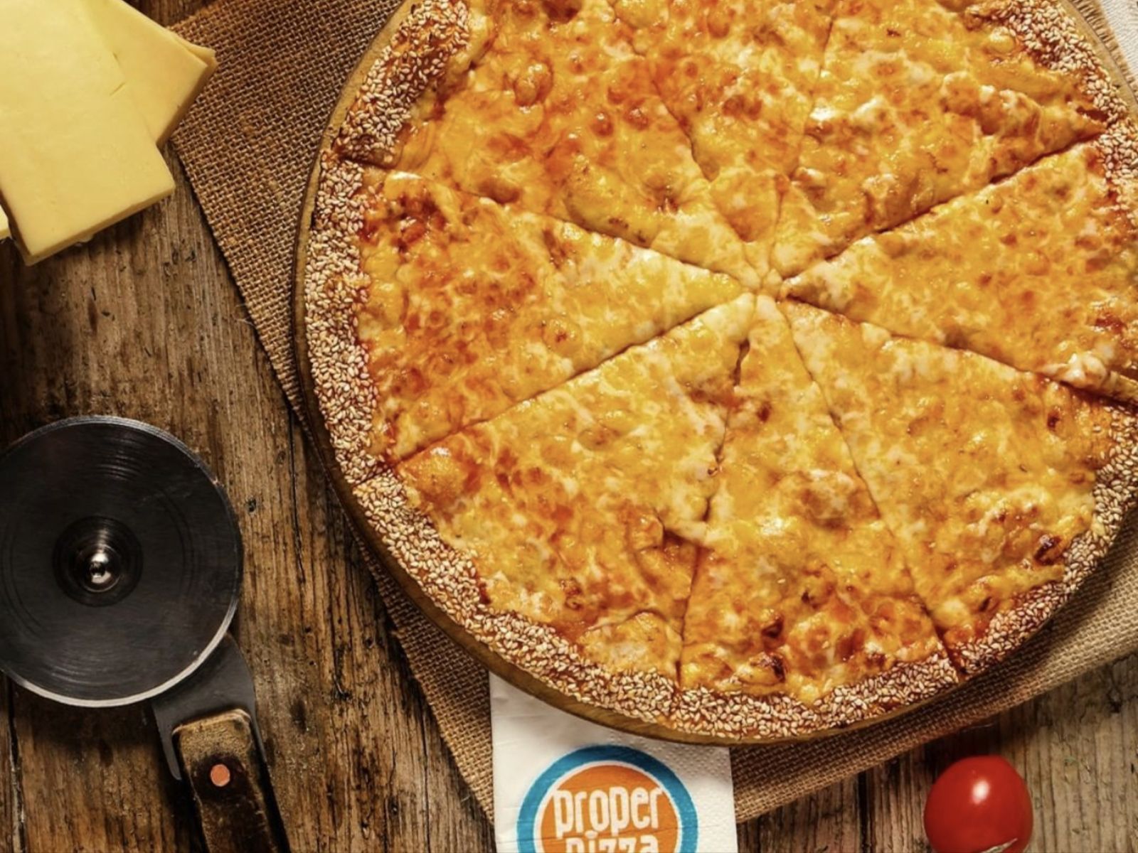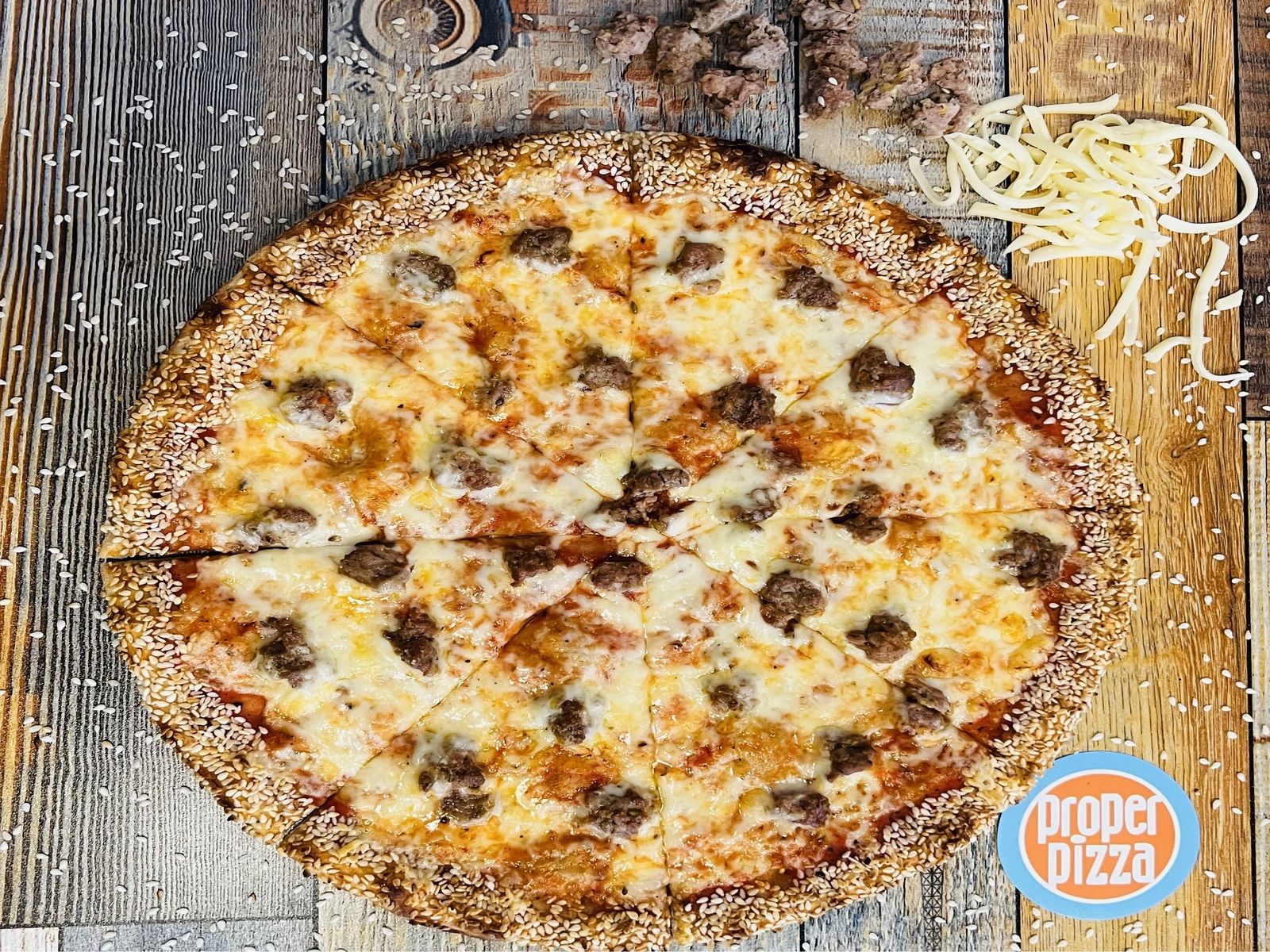 Tomato sauce, special proper chees, sausage, sesame seeds