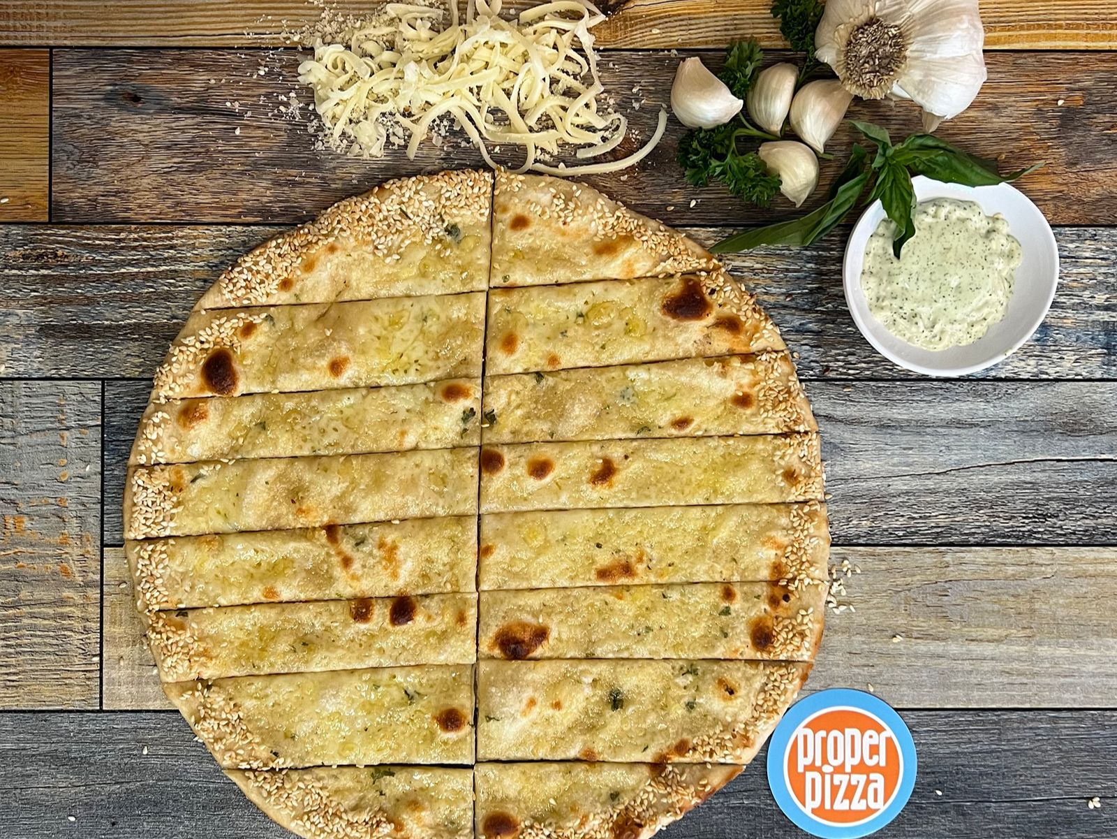 White sauce, special proper chees, gorgonzola, parmesan, fresh mozzarella, sesame seeds,