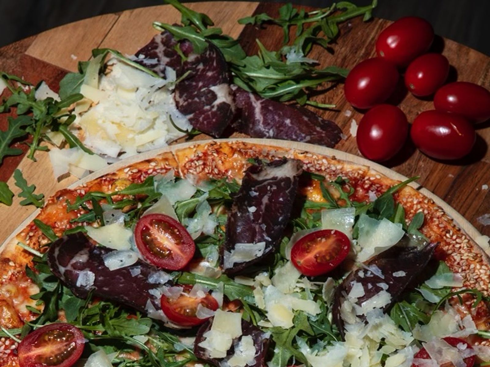 Tomato sauce, special proper cheese, smoked beef prosciutto, smoked beef sausage, mushrooms, and sesame seeds.