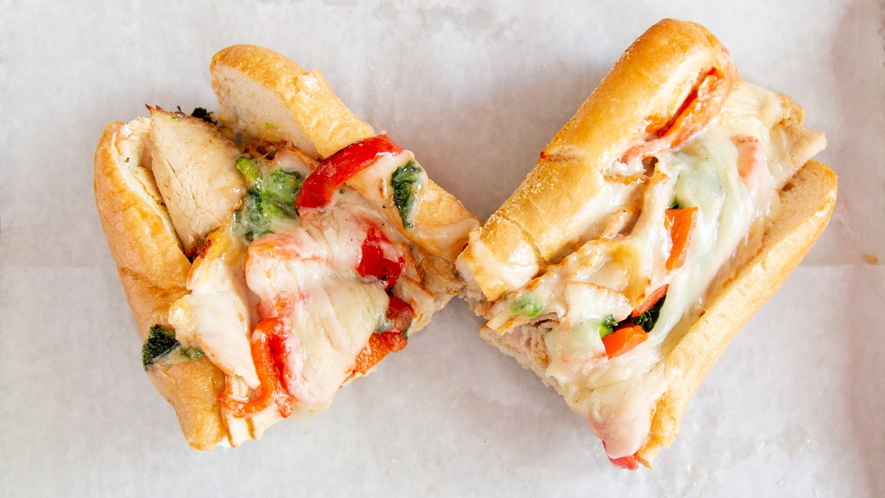 Soy sausage, sauteed wild mushrooms, grilled onions, white American cheese. Philly amoroso rolls. All-white chicken tender substitution available.