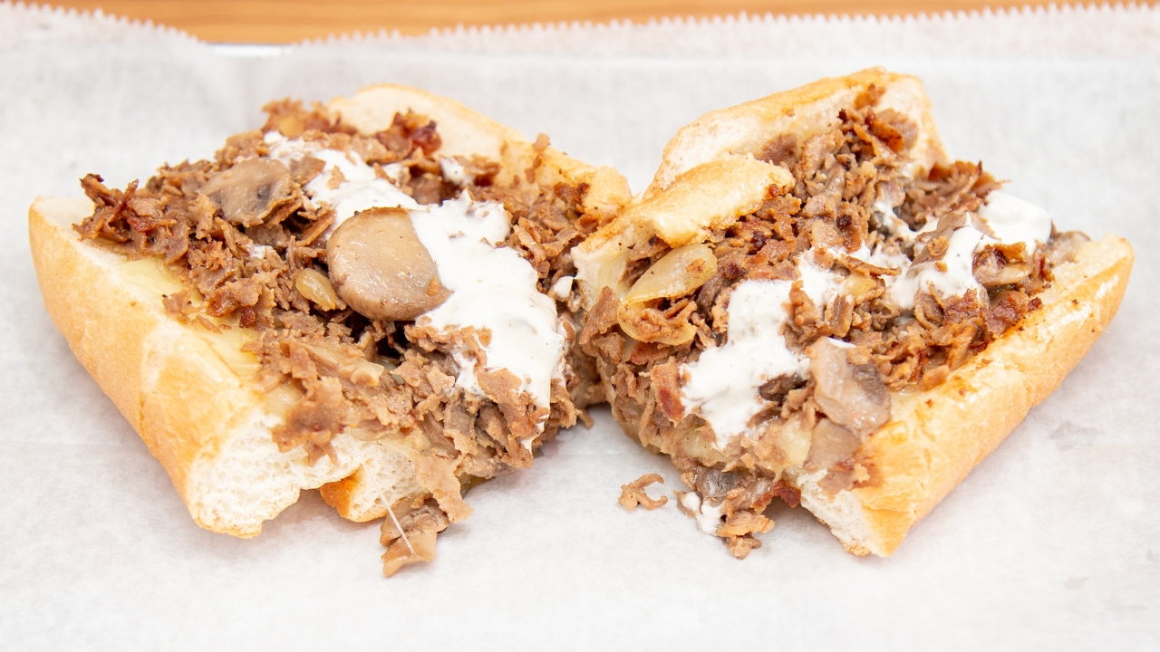 sauteed mushrooms, grilled onions, swiss cheese, horseradish cream sauce. Prepared with Black Angus rib-eye and served on Philly amoroso rolls. All-white chicken breast substitution available.