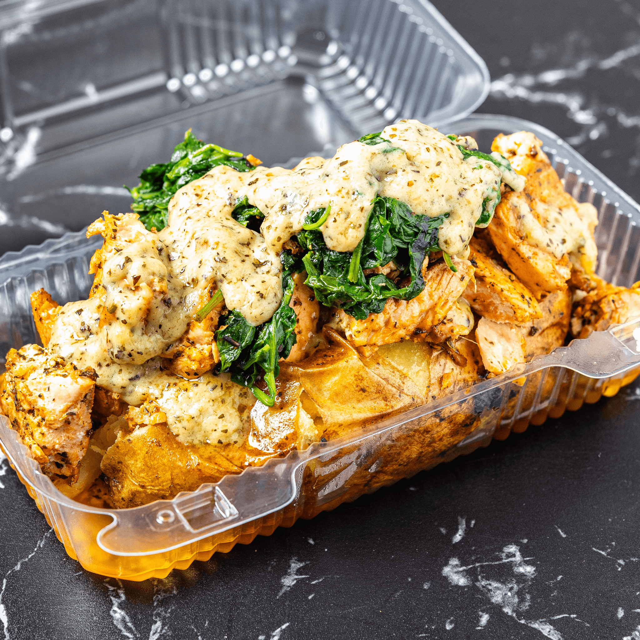 Smothered in garlic butter and Alfredo sauce, topped with sautéed spinach.