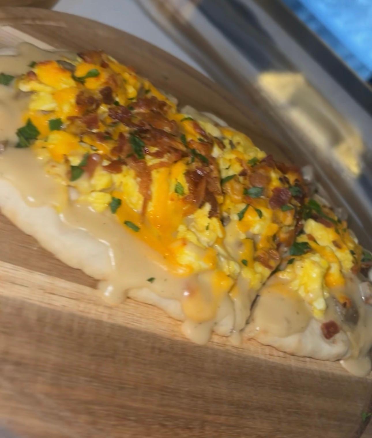 Country gravy, scrambled egg, sausage, bacon, and cheese with Turkey as an option add-on