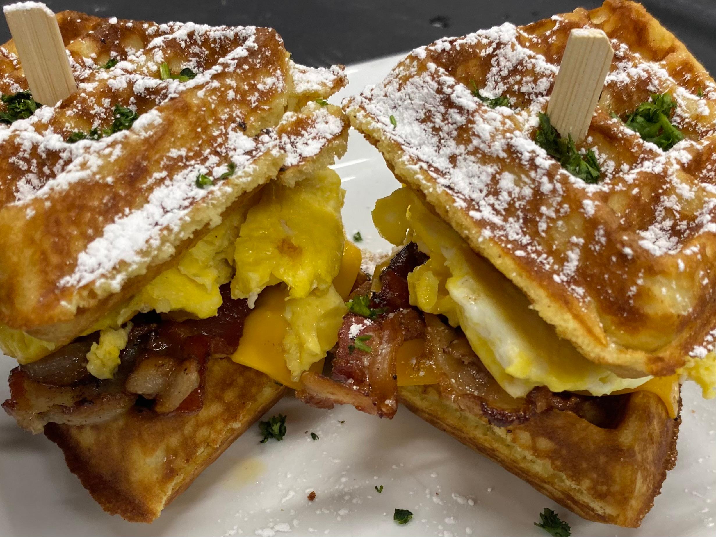 Waffles, Biscuits, Eggs, cheddar cheese Bacon meat if Choice (Turkey or Pork)