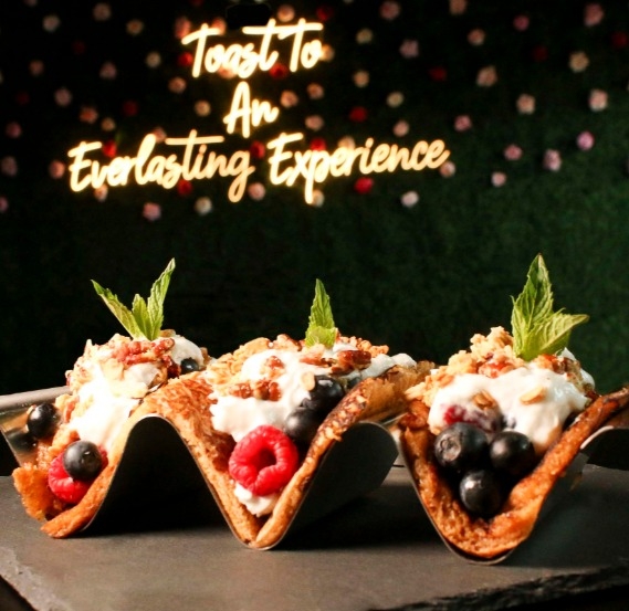 Whipped Cream cheese, Blueberries, strawberries, raspberries topping with Granola and Roasted Pecans