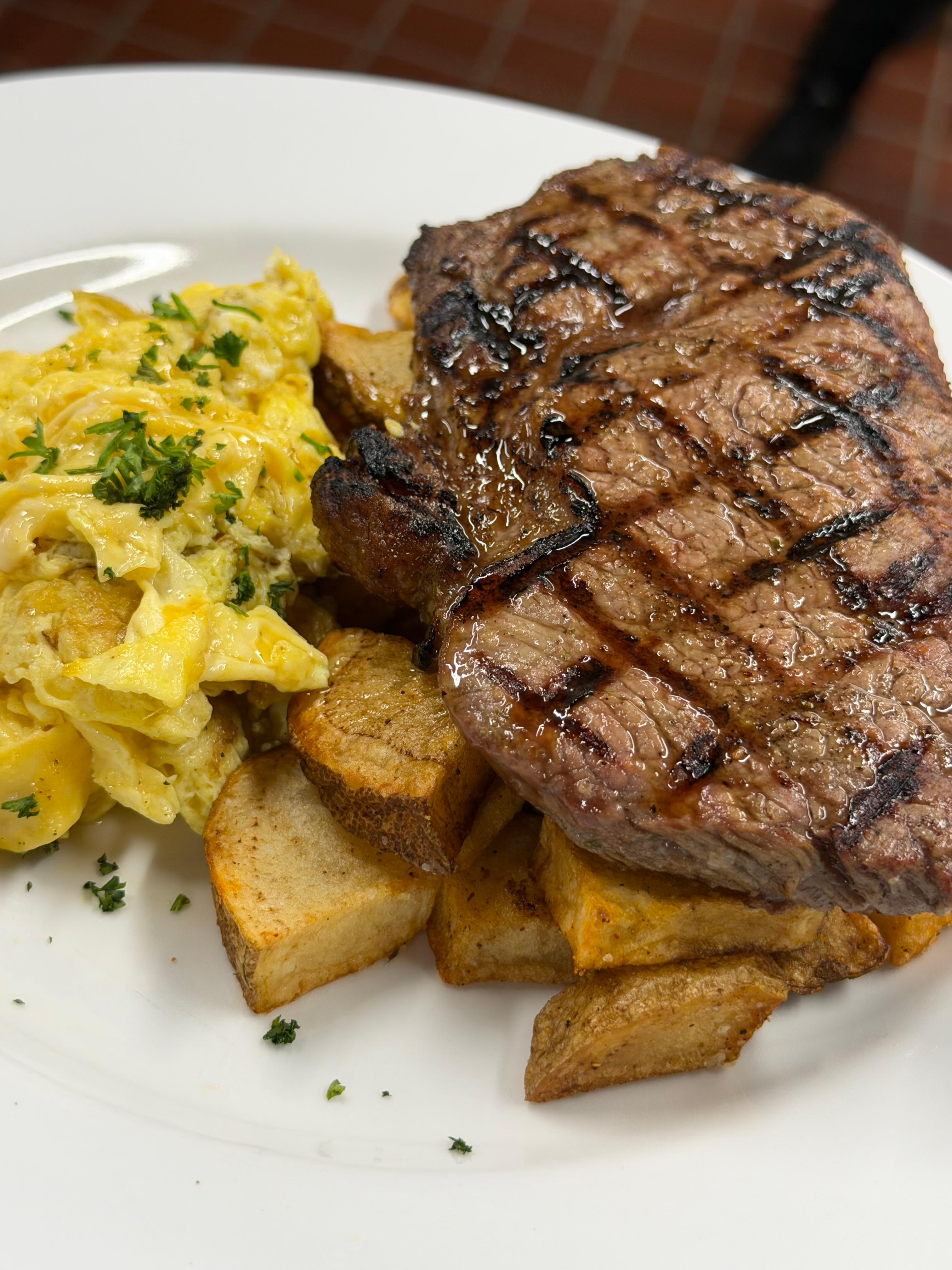 Ribeye steak of your choice seasoned potatoes, eggs and toast