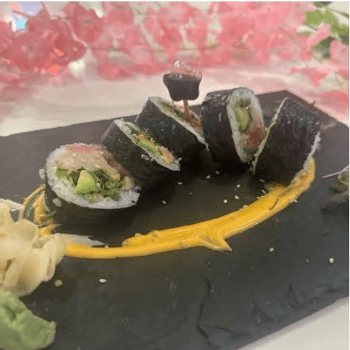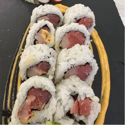 8 pieces. Shrimp tempura, avocado, cucumber, cream cheese topped with seared spicy tuna with unagi sauce and spicy mayo.