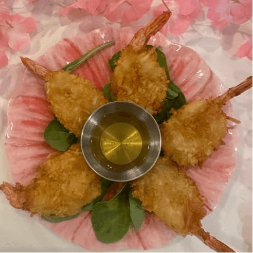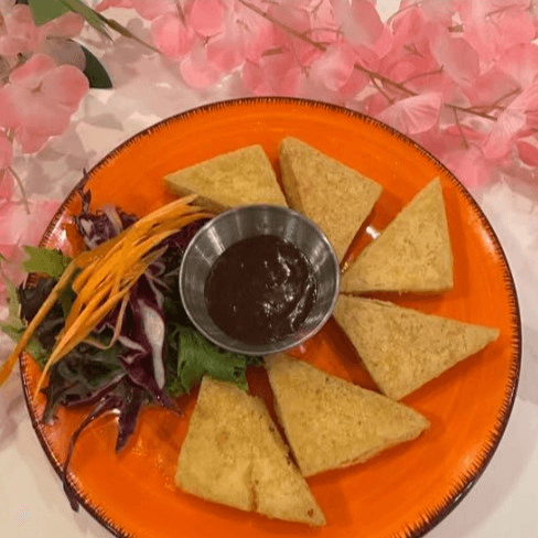 8 pieces. Shrimp tempura, cheese, crab stick and cilantro deep fried and topped with spicy salmon, crunchy, tobiko, spicy mayo, hot and sweet sauce