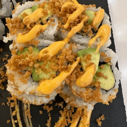 8 pieces. Crab stick, avocado, cucumber deep fried topped with tobiko, crunchy, spicy mayo and unagi sauce