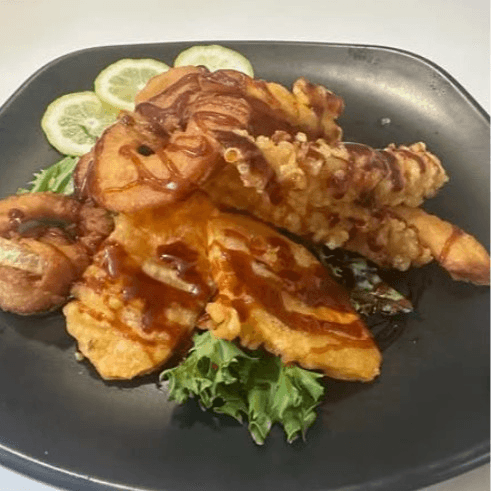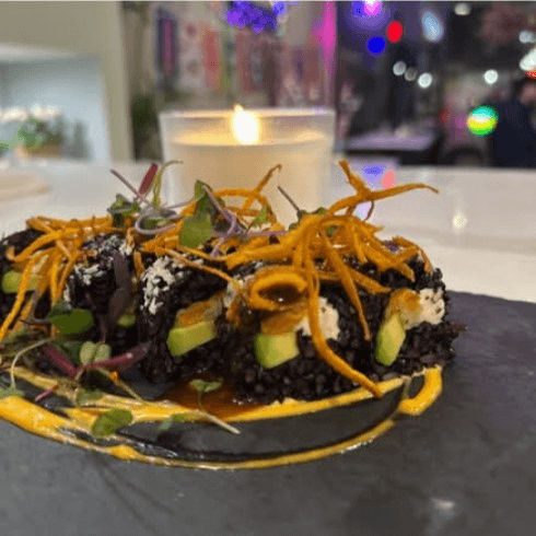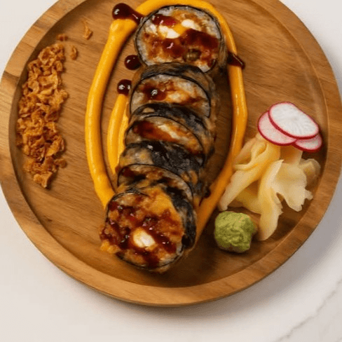 Black rice, sweet potato tempura, avocado, cream cheese, topped with spicy mayo, sweet soy sauce and tempura crumbs