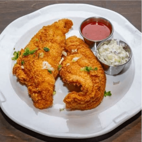 golden fried catfish fillet, scallions, Chef's secret cream sauce