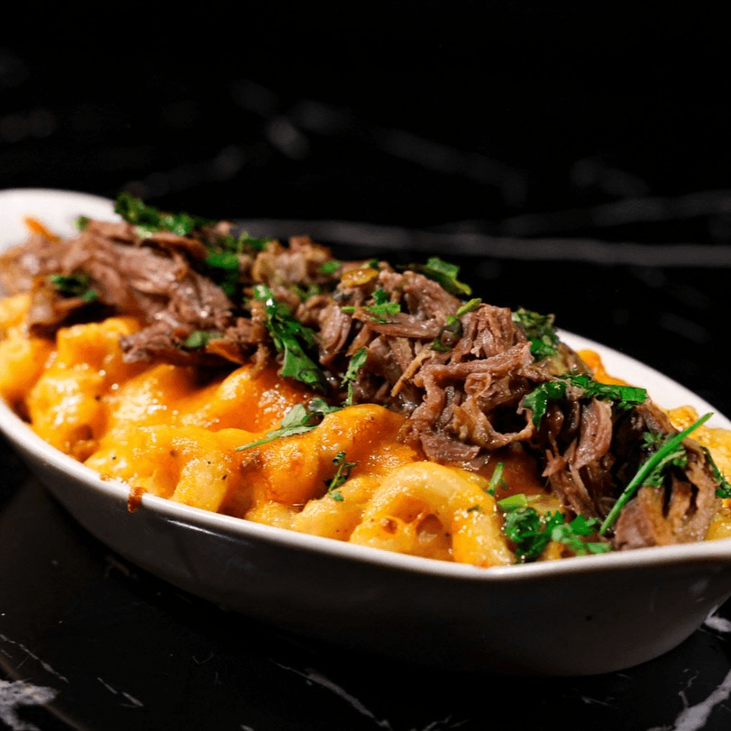 Our premium baked mac & cheese with our seasoned to perfection pulled lamb.