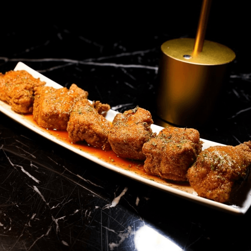 Your choice of fried salmon or shrimp bites in seasoned batter drizzled in our signature honey hot sauce