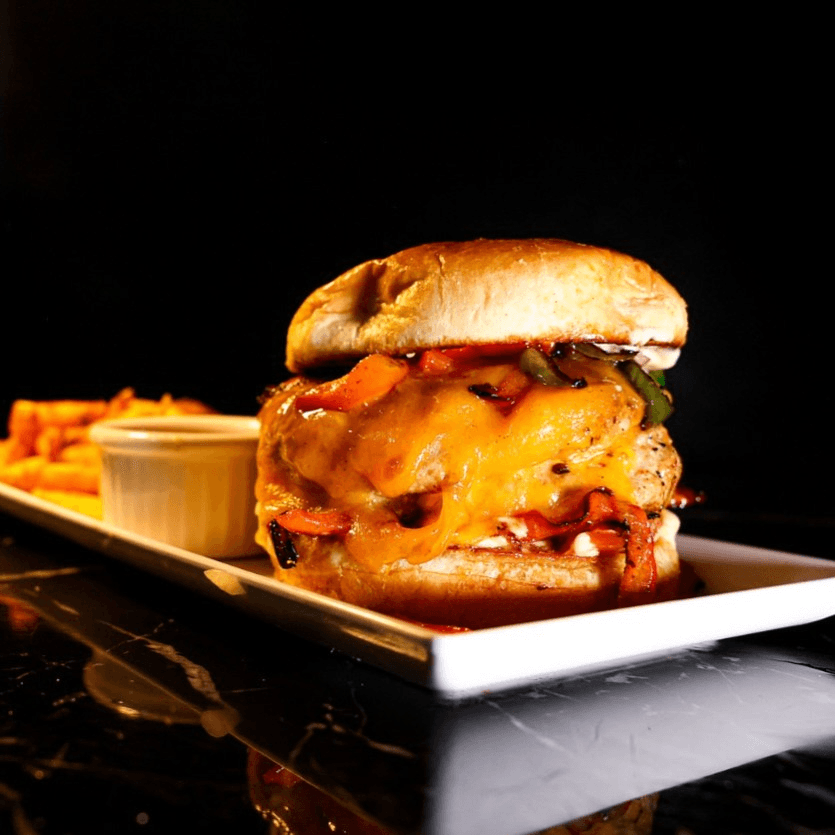 Fried chicken breast on a brioche bun, onions, lettuce, tomato, & pickles. Can be topped with honey hot, jerk, or BBQ sauce. Add ons: hot or mild giardiniera, cheddar, American, mozzarella, red & green bell peppers for additional cost